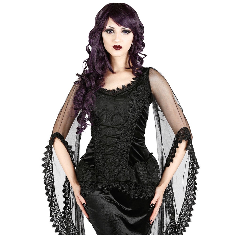 Wunderschönes, tailliertes Gothic Top aus schwarzem Samt mit luftigen Tüll-Glockenärmeln, reich verziert mit Tüll, Samtschleifen und Spitzenbordüren.