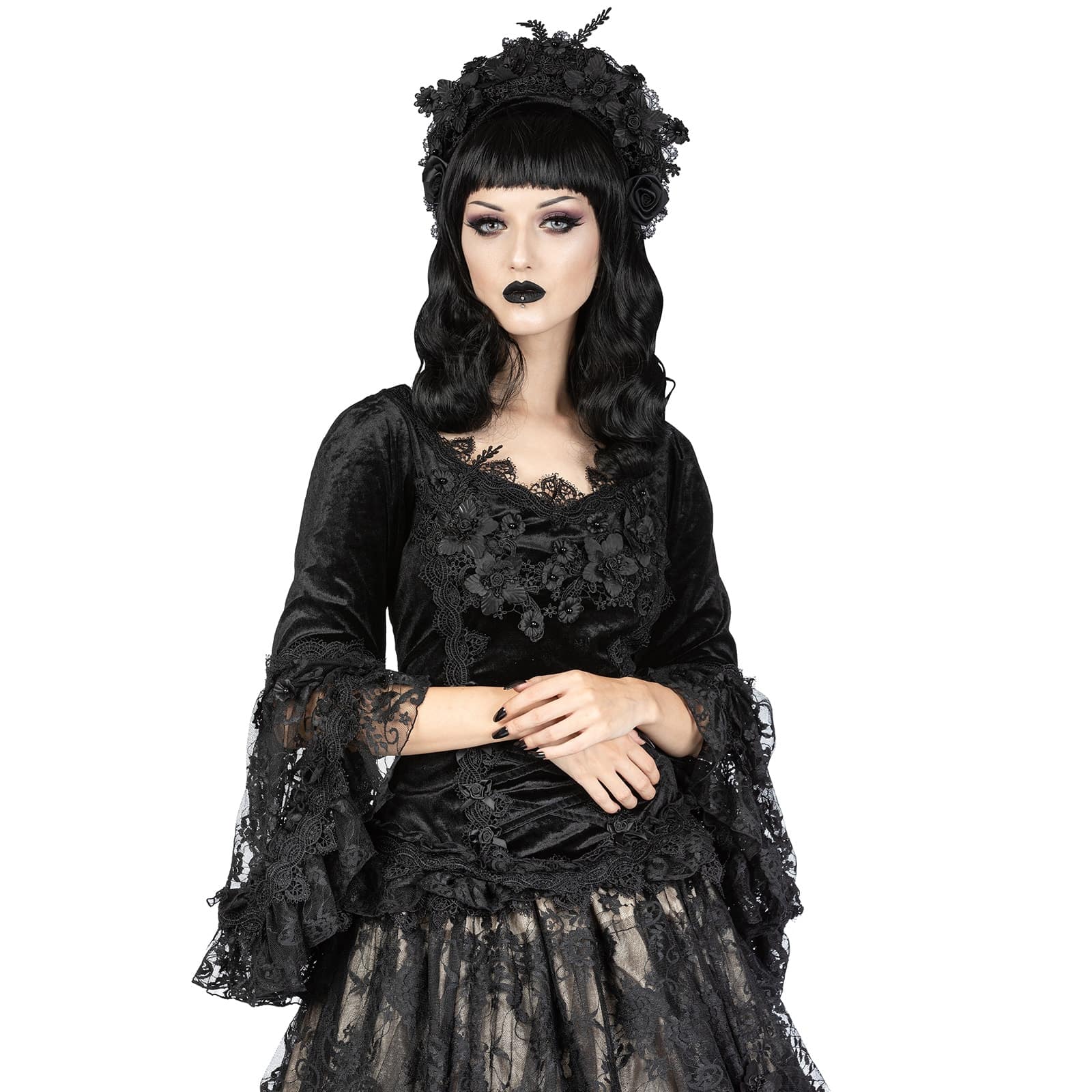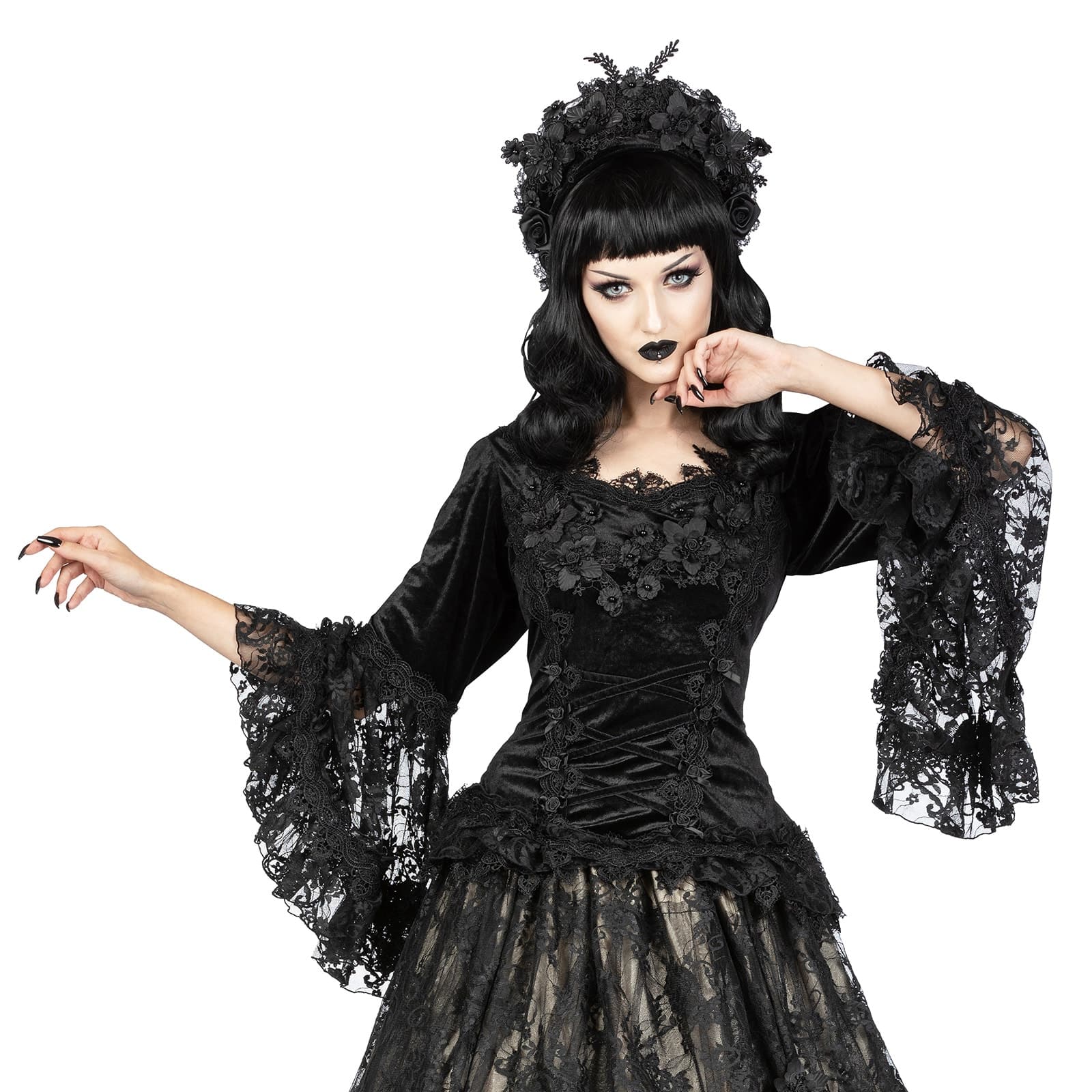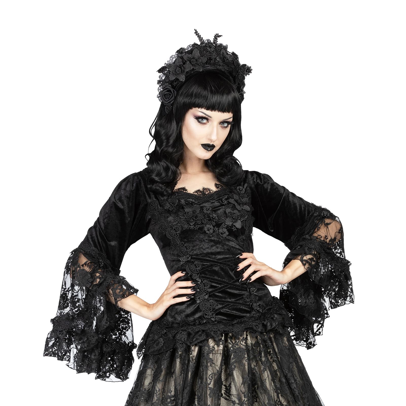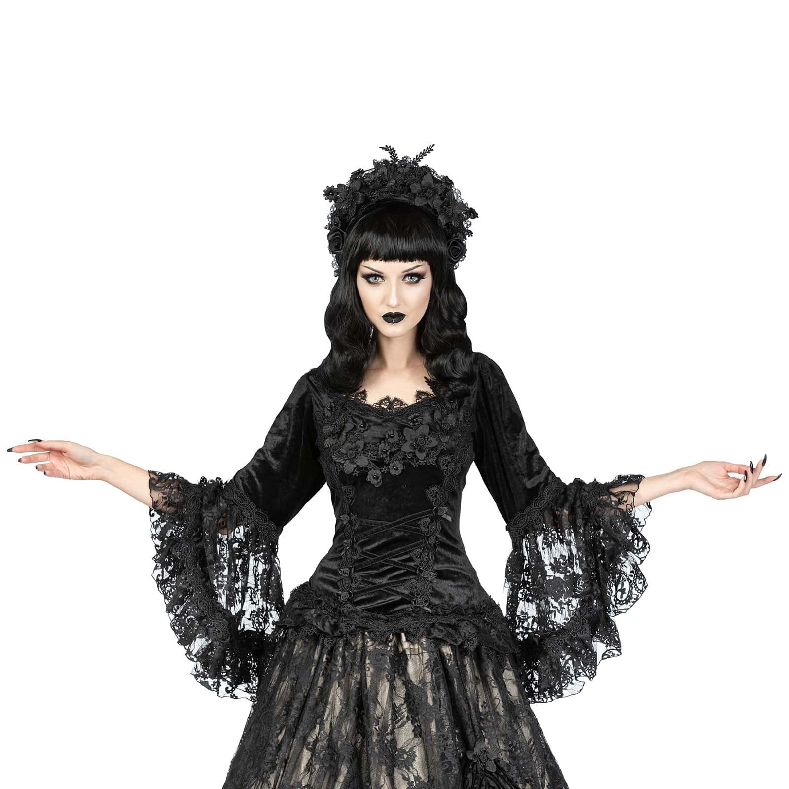 Schwarzes mittelalterliches Oberteil mit herzförmigem Ausschnitt und ausgestellten Ärmeln aus französischer Spitze. Die Mittelbahn des samtenen Oberteils ist mit einer kreuz und quer verlaufenden Samtbandapplikation verziert und ist großzügig mit Brokatapplikationen und Blumen verziert. Auf beiden Seiten ist die Vorderseite mit venezianischer Spitze besetzt, die mit schwarzen Satinschleifen verziert ist und mit einer kleinen Rosenknospe gekrönt ist. Die Samtärmel haben unterhalb des Ellenbogens ausgestellte Spitzenärmel. Der Ärmel aus französischer Spitze wird von einer kleinen schwarzen Blume gerafft und ist mit einer breiten Reihe gerüschter französischer Spitze verziert, die mit venezianischer Spitze besetzt ist.