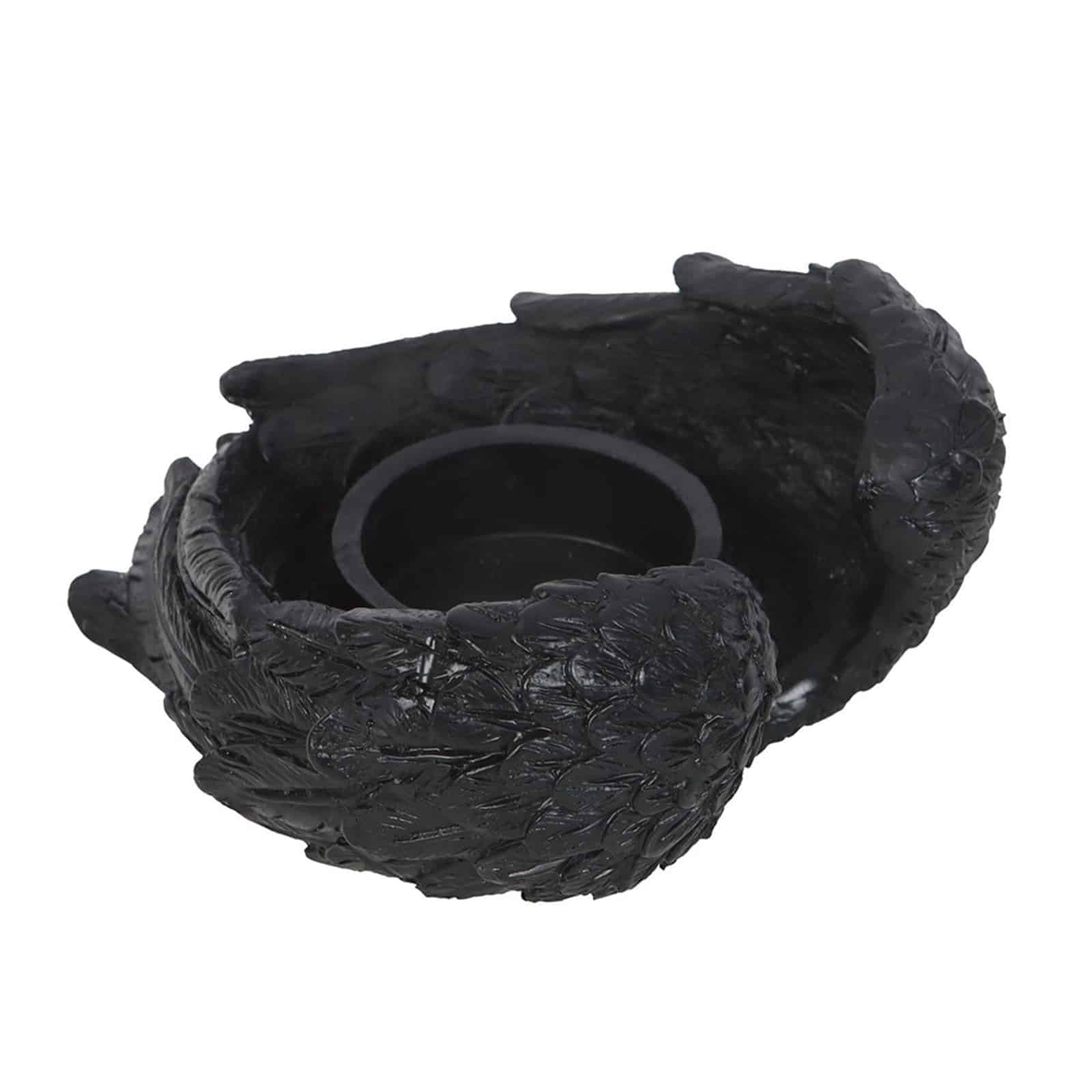 Erhellen Sie Ihren Raum mit der eindringlichen Schönheit dieses Teelichthalters in Form von Rabenflügeln. Ideal für eine stimmungsvolle Atmosphäre, perfekt für Wohnzimmer oder Altäre im Gothic-Stil.