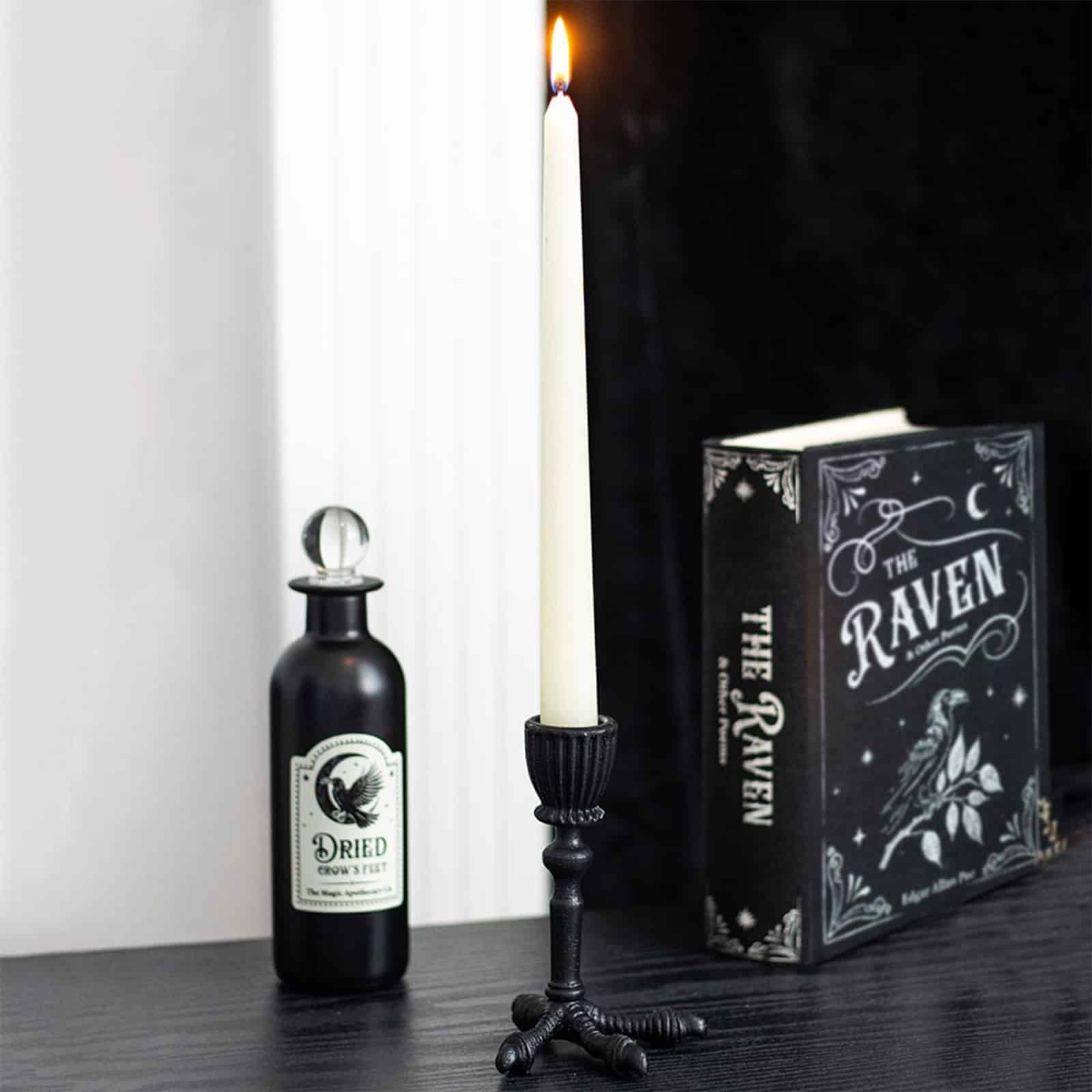 Perfekt geeignet für schmale Stabkerzen, setzt dieser Kerzenhalter stimmungsvolle Akzente auf Altären, Sideboards oder Fensterbänken. Ob als markantes Highlight zu Halloween oder als dauerhaftes Statement für Gothic-, Dark- oder Witchcore-Einrichtungen – dieses Dekoelement verleiht jedem Raum eine geheimnisvolle Atmosphäre.