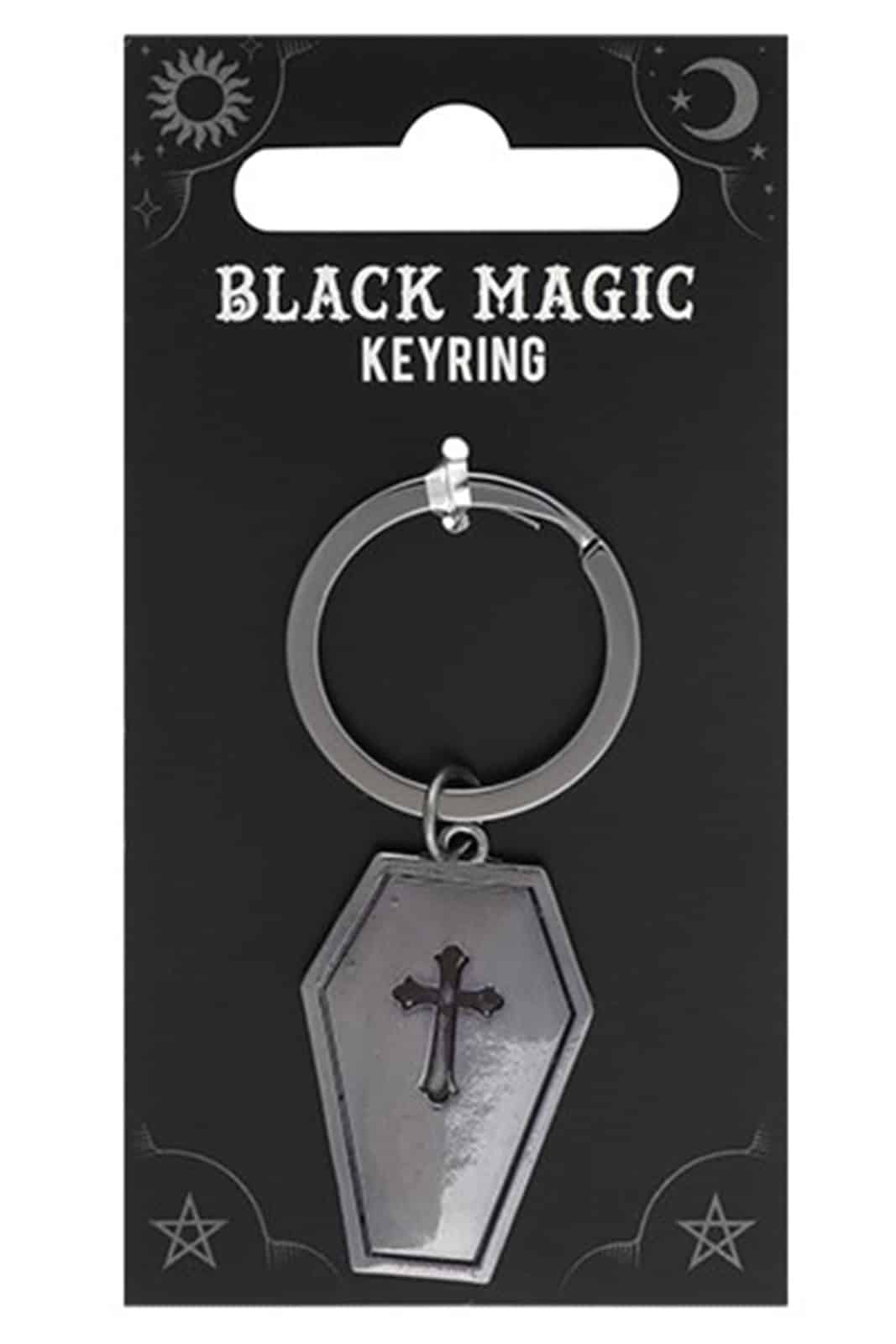 Widerstandsfähiger Schlüsselanhänger aus Metall in Form eines Sarges mit einem schwarzen Kreuz.