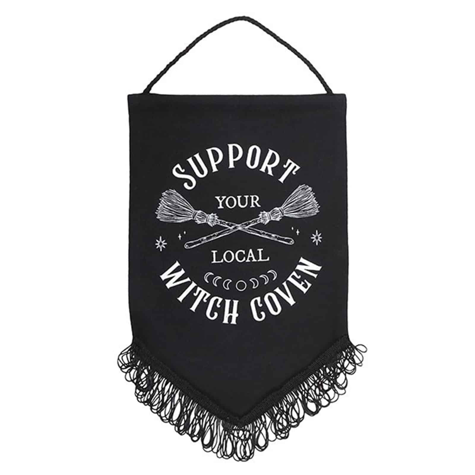 Ein schwarzes Stoffbanner mit dem Schriftzug Support Your Local Witch Coven und einem sich kreuzenden Besen-Motiv – ein starkes, gotisch-magisches Statement. Perfekt für Altäre, Wände oder Fenster.