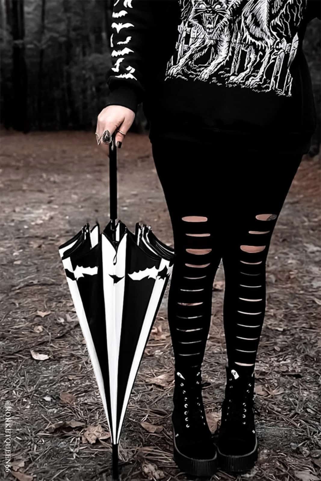 Ein ausdrucksstarker Pagoden-Schirm mit kontrastreichem Spiralstreifen-Design und dekorativen Fledermausmotiven. Die markante Fledermausflügelkante verleiht dem Schirm eine dramatische Silhouette und macht ihn zum perfekten Accessoire für Gothic- und Alternative-Styles.