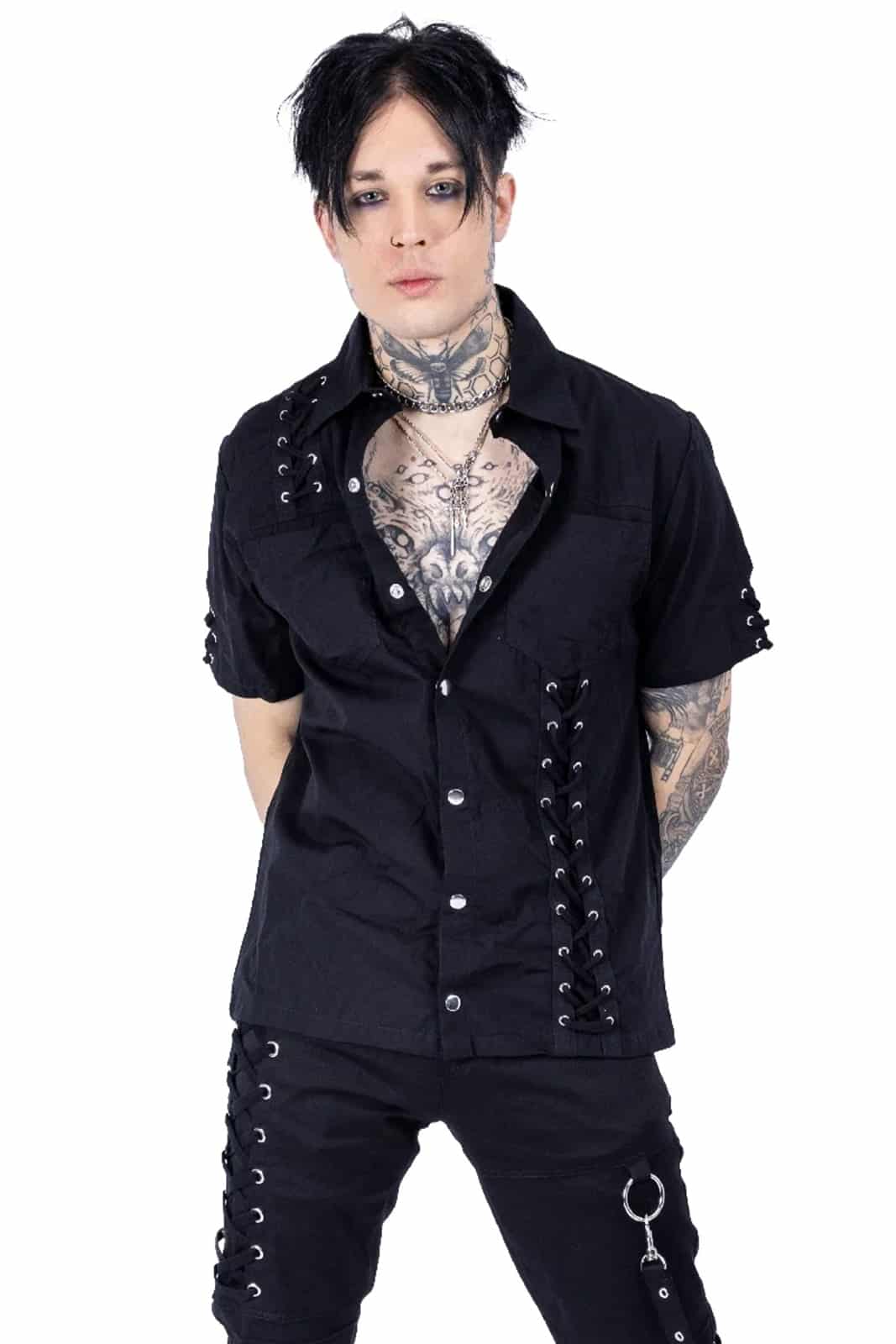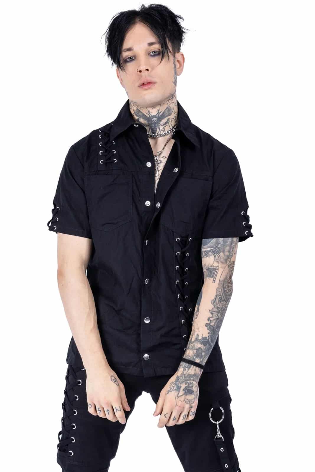 Gothic Kurzarmhemd aus reiner Baumwolle, verziert mit vielen Ösen, Zierschnürung und kleinem Stehkragen. Die Front ist mit zwei Brusttaschen bestückt und durchgehend geknöpft. Im Nacken mit Vixxsin-Logo.