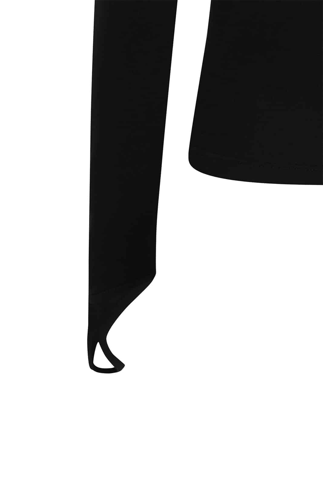 Dieses schwarze Banned Oberteil vereint klare Linien mit markanten Details. Ein V-förmiger Mesh-Einsatz am Ausschnitt, eingefasst von silberfarbenen Ösen und einem zentralen Riemen mit O-Ring, verleiht ihm eine starke, alternative Note. Die langen Ärmel enden in spitz zulaufenden Bündchen mit Daumenschlaufen und sorgen für einen dramatischen Look. Figurbetont geschnitten, ideal als Statement-Piece oder für Lagenstyles im Gothic- und Punk-Bereich.