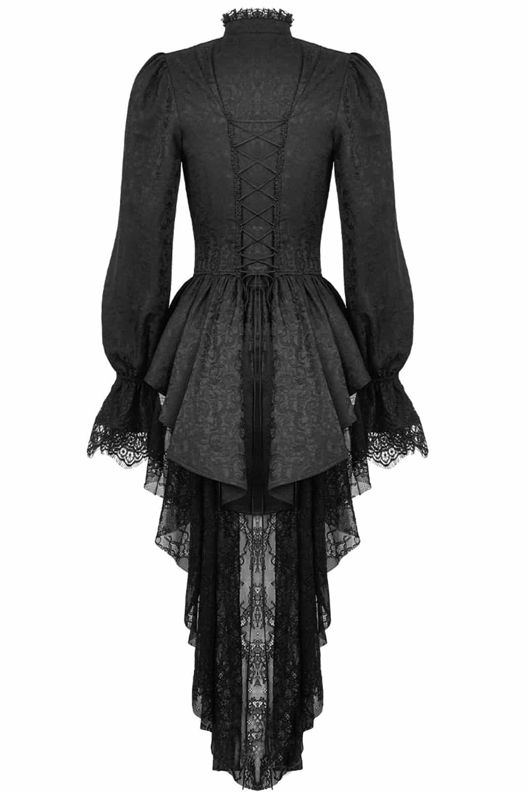 Die „Lunar Spells“-Jacke verleiht jedem viktorianisch-gotischen Look eine dramatisch-elegante Note. Gefertigt aus schwarzem Brokat mit dezentem Glanz, ist sie tailliert geschnitten und wird vorn mit einem Reißverschluss geschlossen. Der schmale Oberkörper wird durch einen ausgestellten Schößchensaum betont, während der Rücken mit feinen Falten und einer transparenten Spitzenschleppe veredelt ist. Die weit geschnittenen, romantischen Bündchen enden in gerafften Spitzenmanschetten. Auf der Brust sorgt ein halbtransparenter Einsatz mit Spitzenapplikationen und zarter Perlenverzierung für einen geheimnisvollen Akzent. Eine raffinierte Rückenschnürung unterstreicht die feminine Silhouette und rundet das Design kunstvoll ab.