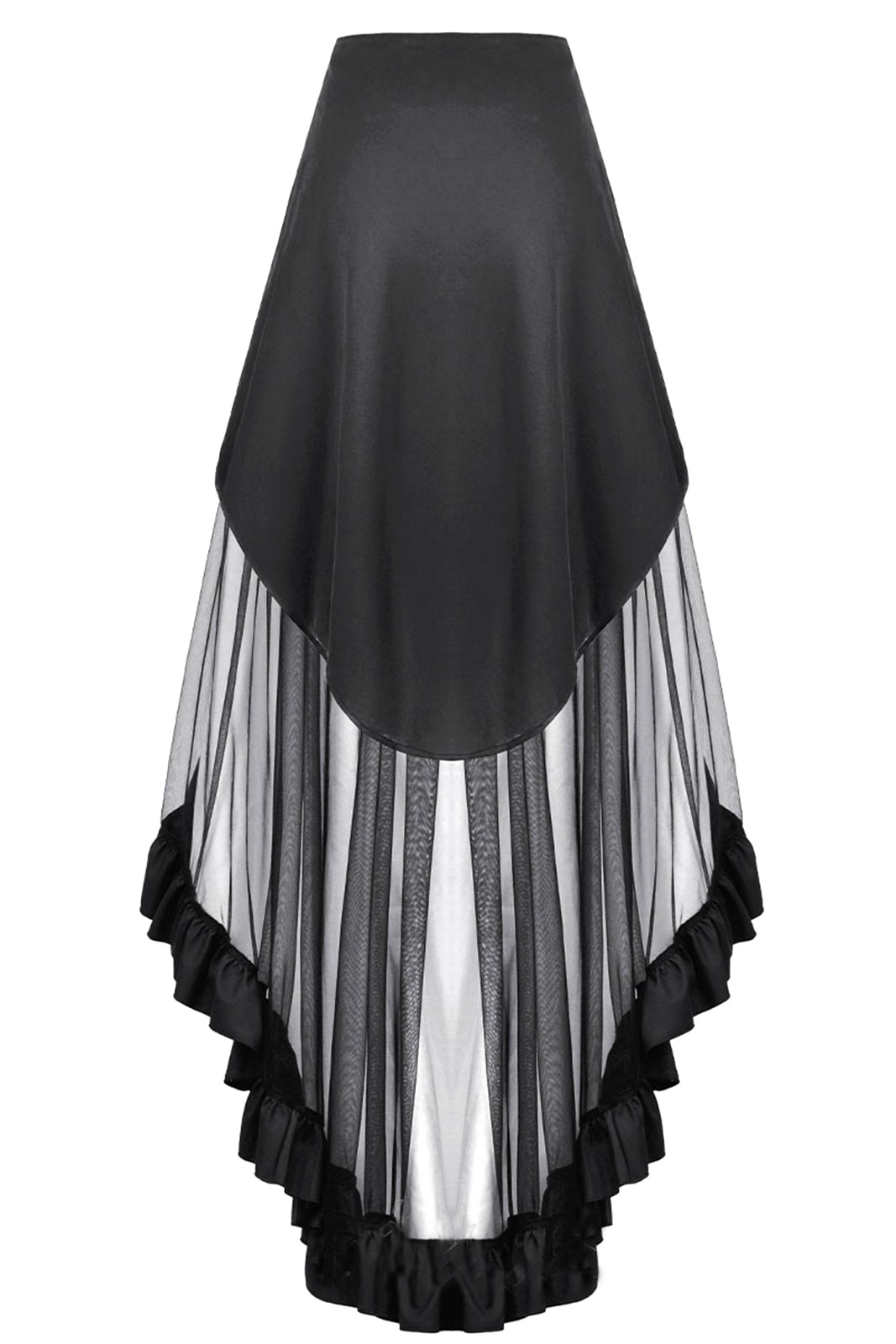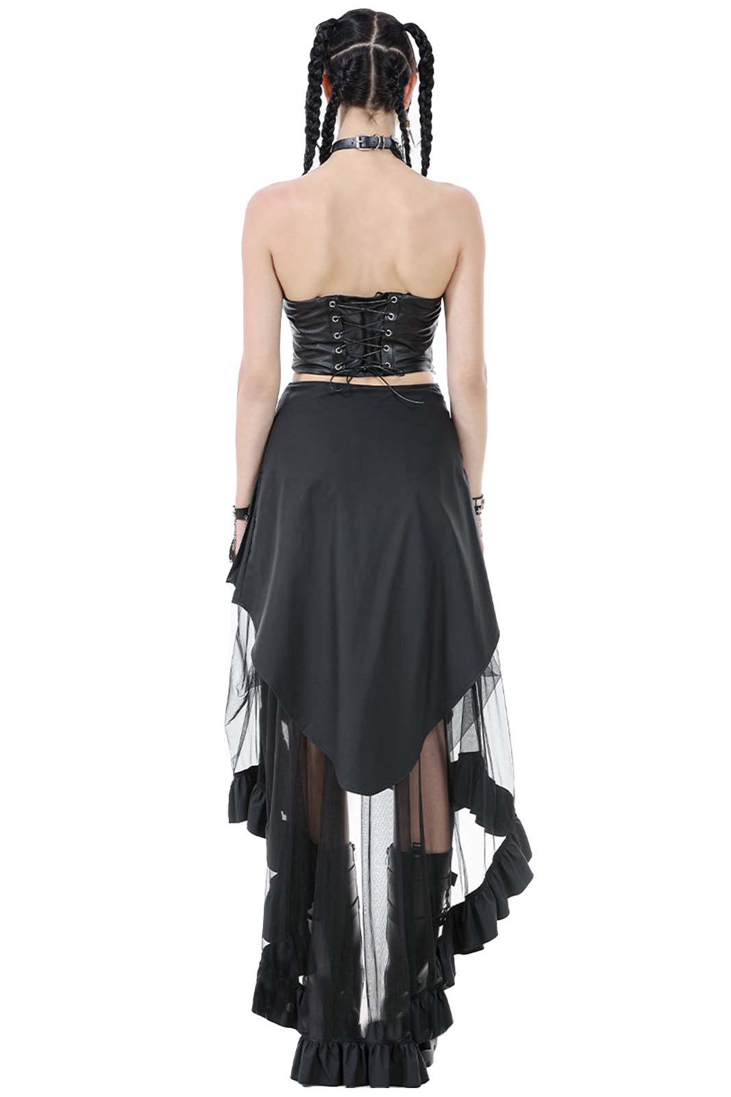 Ein Rock, der dunkle Eleganz und rebellische Details perfekt vereint. Der „Pandora Arcanum“ kombiniert glänzendes Kunstleder mit transparentem Tüll, verziert mit Rüschen und markanten Ösenriemen. Der High-Low-Schnitt betont die Silhouette und sorgt für einen dramatischen Auftritt – ob auf Festivals, in Clubs oder im Alltag mit Stil.