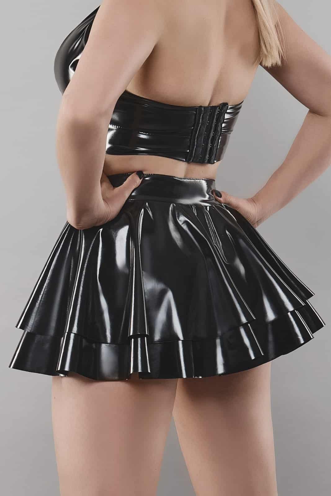 Short basque skirt in black patent. It is characterized by the numerous attributes visible in the images. The front is open and is fastened at the waist with two decorative silver-colored studs. There are two layers of ruffles all around for a unique look. The skirt is made entirely of black, shiny and elastic vinyl.