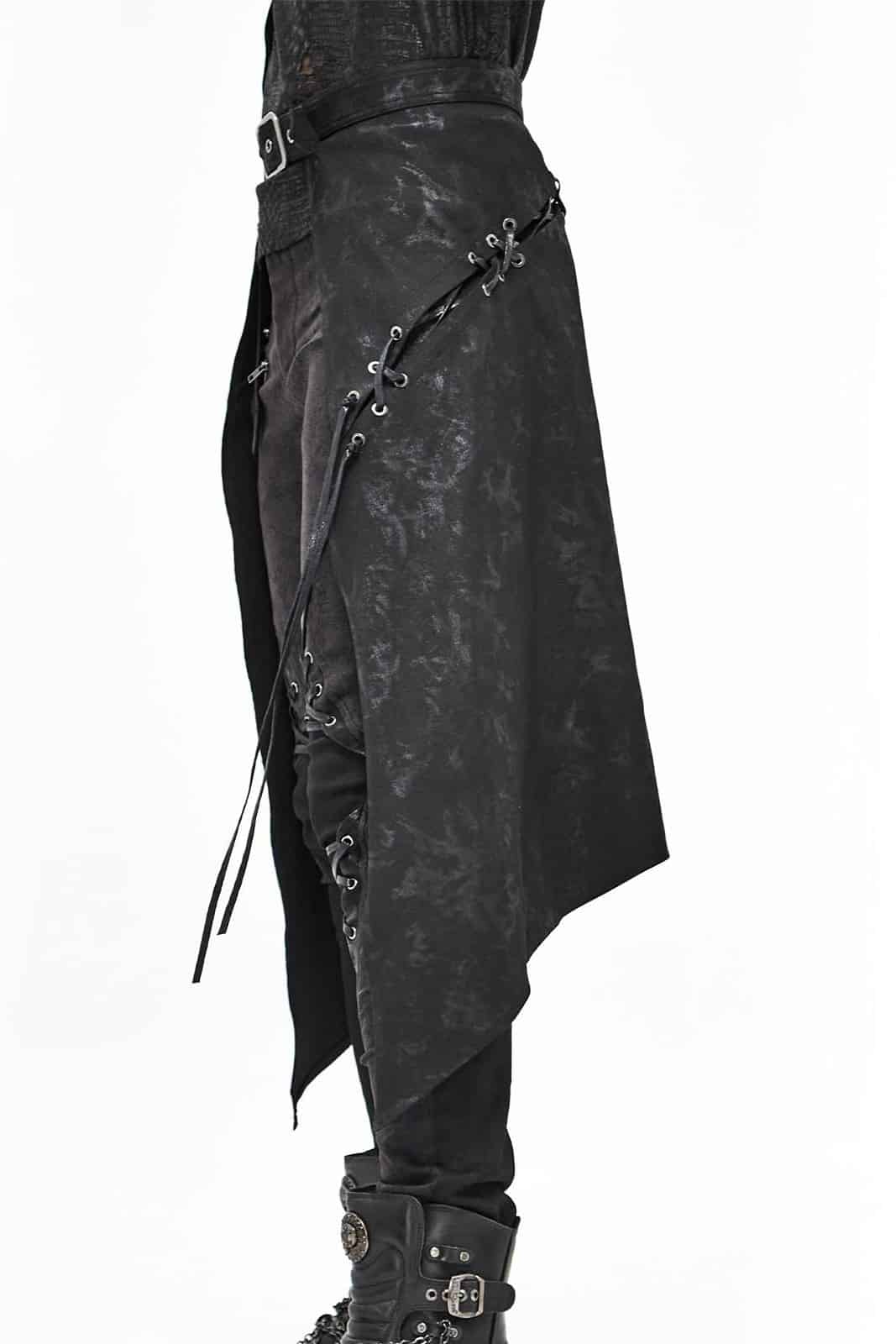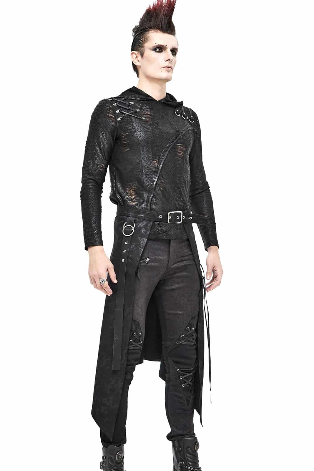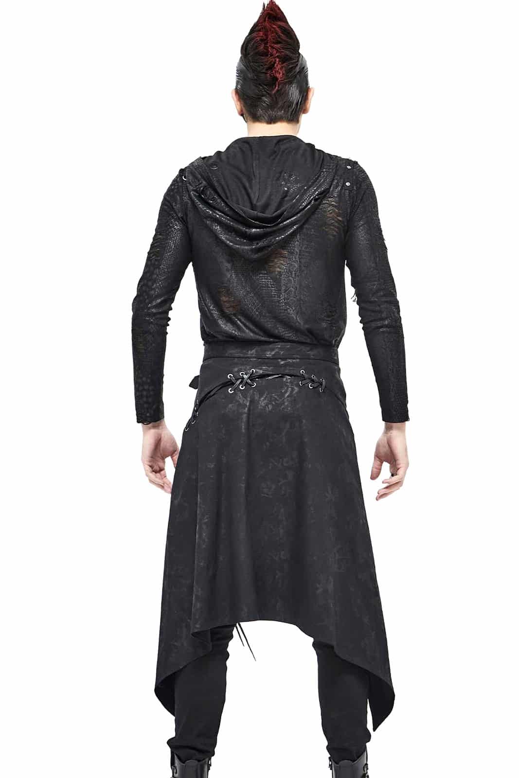 Postapokalyptischer Überrock mit verstellbarem Gürtel und Schnürdetail. Verziert mir Riemen, Pyramiedennieten und O-Ringen.