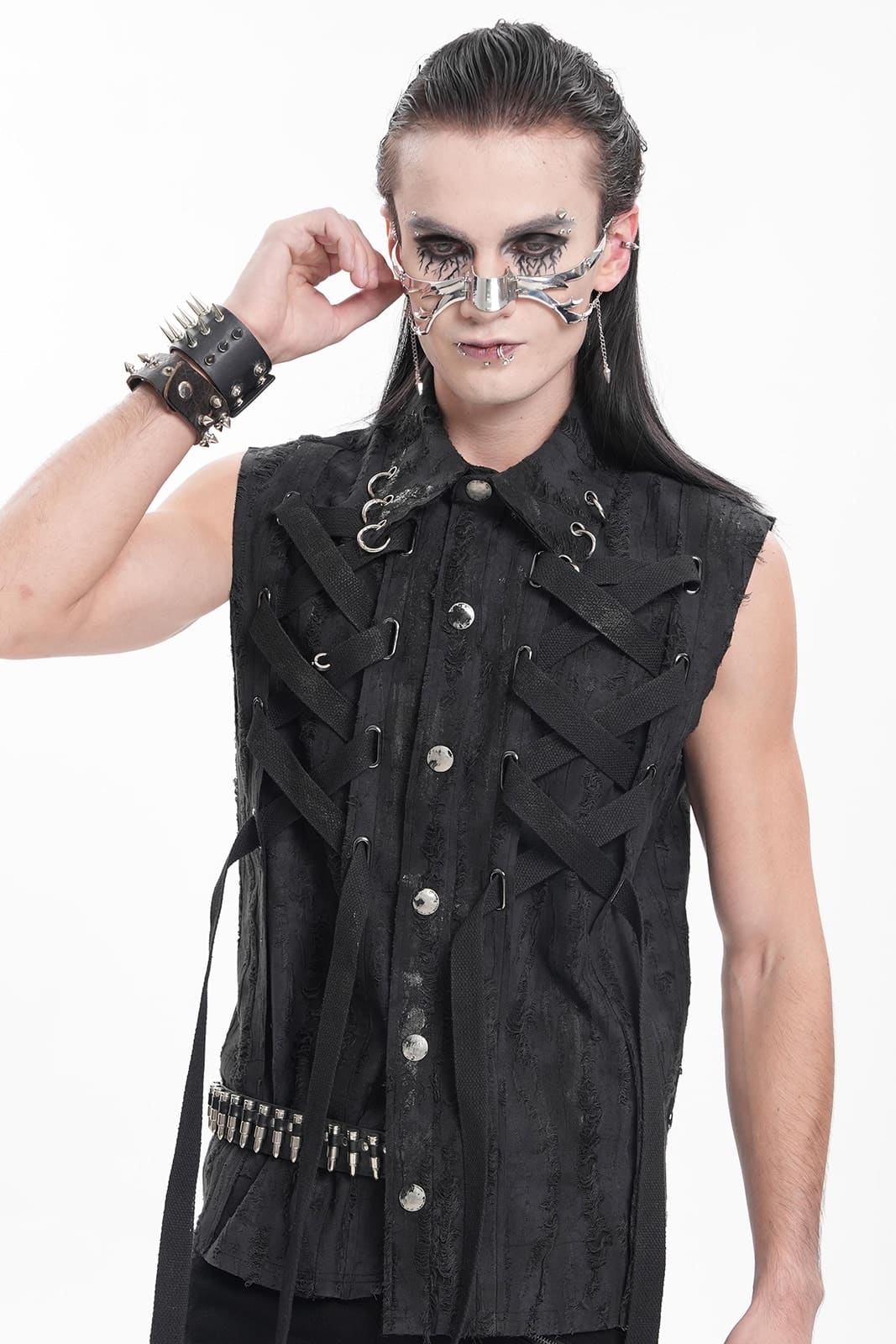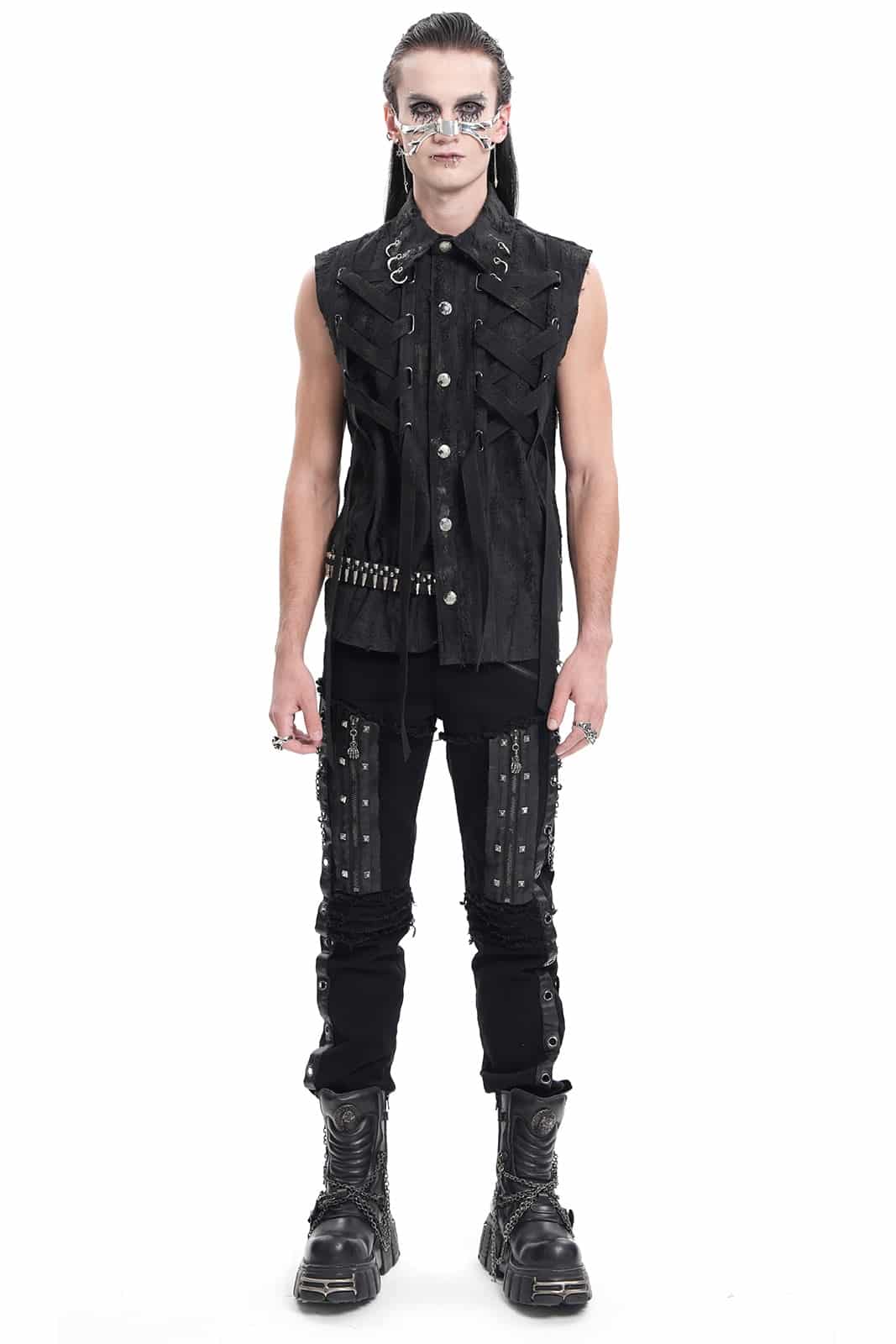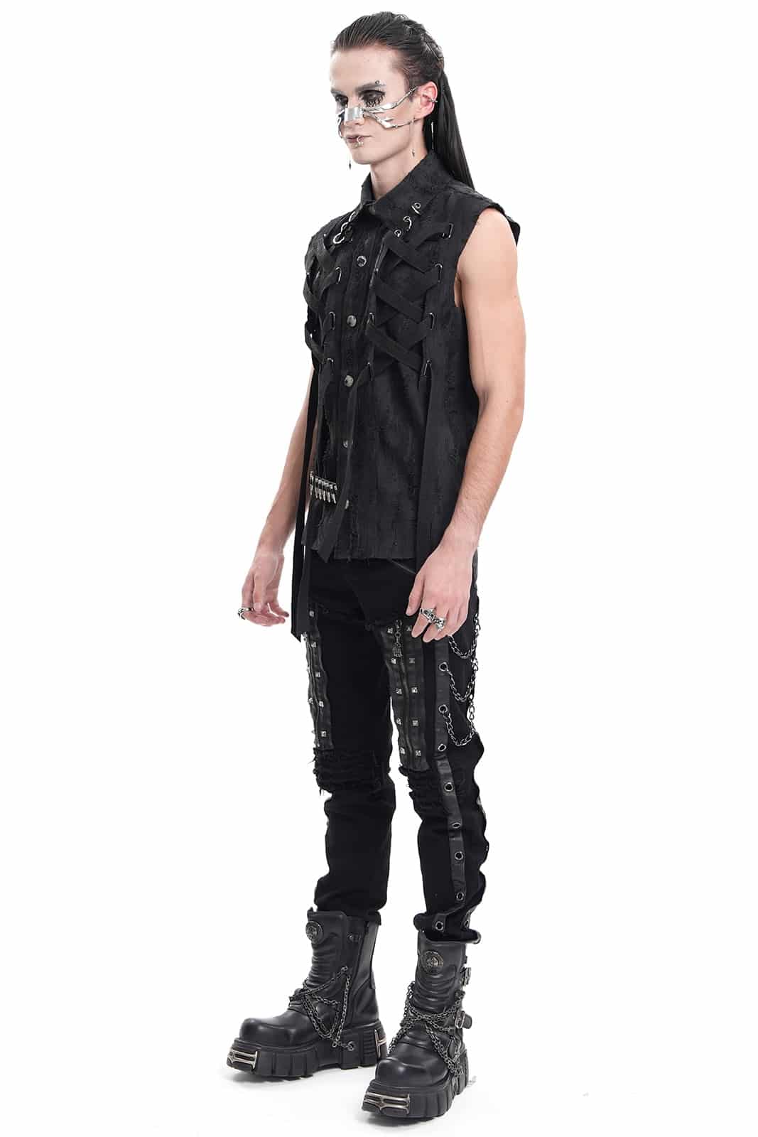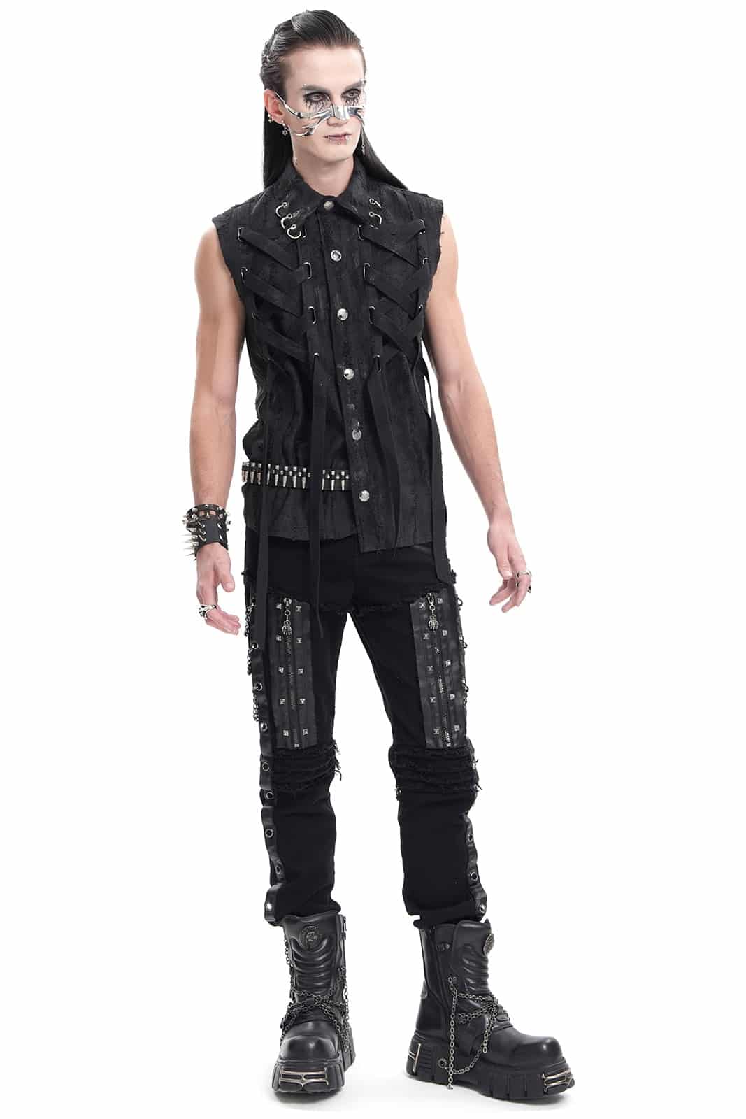 Die X-Files Weste ist ein echtes Statement für alle, die sich nicht scheuen, aufzufallen. In tiefem Schwarz gehalten und mit einem lässig abgewetzten Look versehen, verbindet sie den rauen Charme des Punk mit düsteren Gothic-Elementen. Schnürdetails verleihen ihr einen rebellischen Touch, während der körpernahe Schnitt für eine markante Silhouette sorgt. Der Kragen ist mit einem O-Ring verziert, der dem Design zusätzlichen Charakter verleiht, und Druckknöpfe runden den Look ab. Ob auf Konzerten, in dunklen Clubs oder einfach als ausdrucksstarkes Layering-Piece im Alltag – diese ärmellose Weste ist wie gemacht für alle, die modisch ihren eigenen Weg gehen.