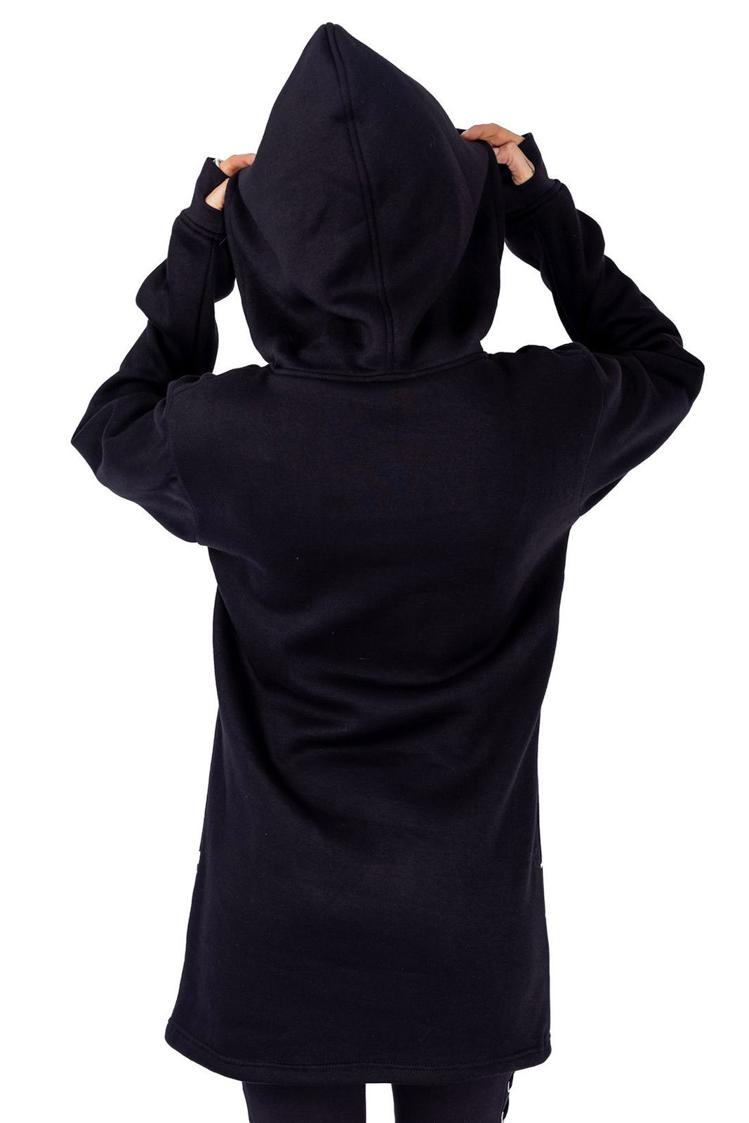 Extra langer Kapuzenpullover mit großer Kapuze und auffäligem Frontprint im Gothic-Cat-Style. Die Ärmelbündchen sind mit Daumenloch ausgestattet. Mit einem Kordelzug kann die Kapuze angepasst werden.