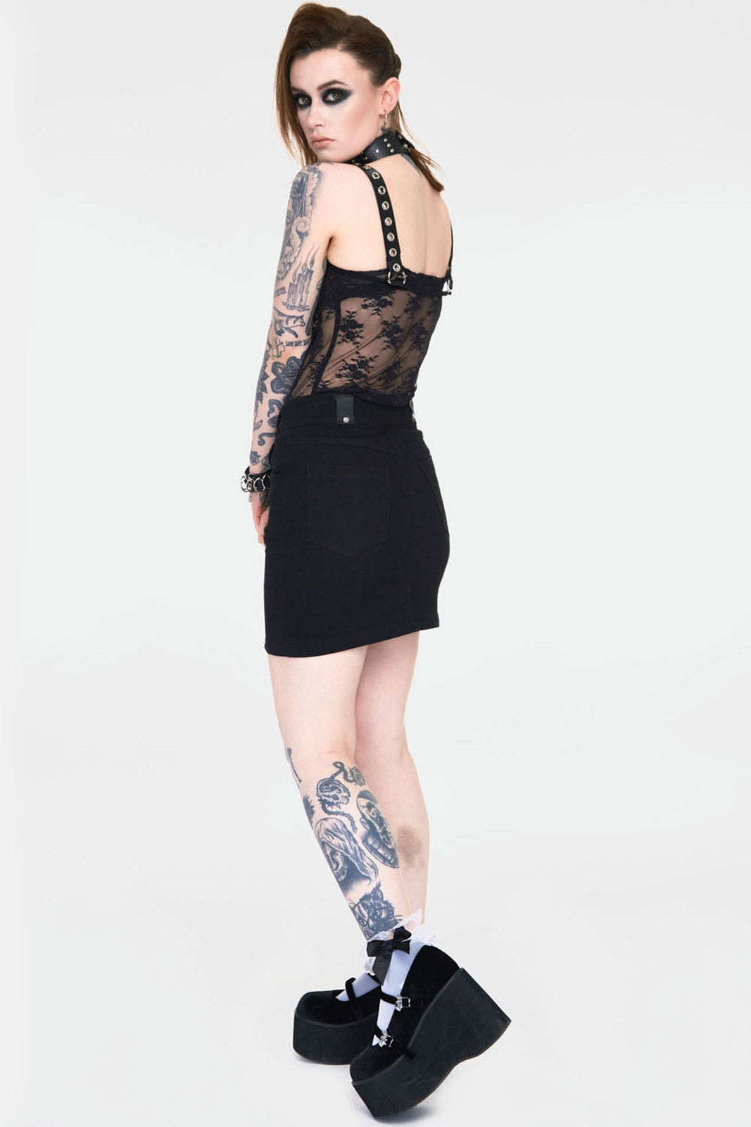 Gothic Jeansrock mit hoher Taille und aufgesetzten Kunstlederriemen, verziert mit Nieten. Ein großer O-Ring dient als Zipper für den vorderen Reißverschluß. Ausgestattet mit zwei Front- und zwei Gesäßtaschen.