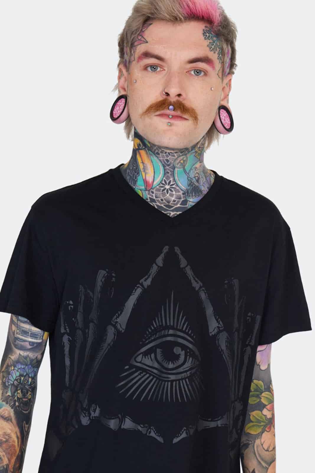 Ein klassisches schwarzes T-Shirt mit V-Ausschnitt, das durch seinen ausdrucksstarken Print im Frontbereich auffällt: Skelettierte Hände formen ein Dreieck, in dessen Mitte das allsehende Auge wacht – ein Symbol zwischen Okkultismus und Subversion. Der Schnitt ist locker und bequem, das Material aus reiner Baumwolle sorgt für angenehmen Tragekomfort. Die Rückseite ist schlicht schwarz gehalten. Ein ideales Shirt für alle, die ein minimalistisches Design mit tiefer Symbolik suchen.