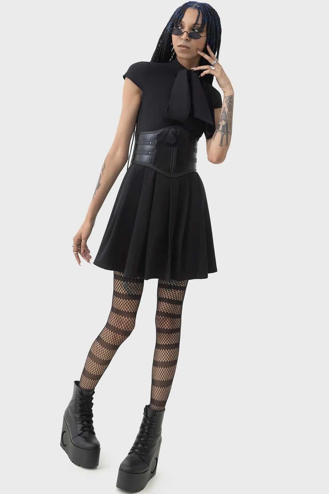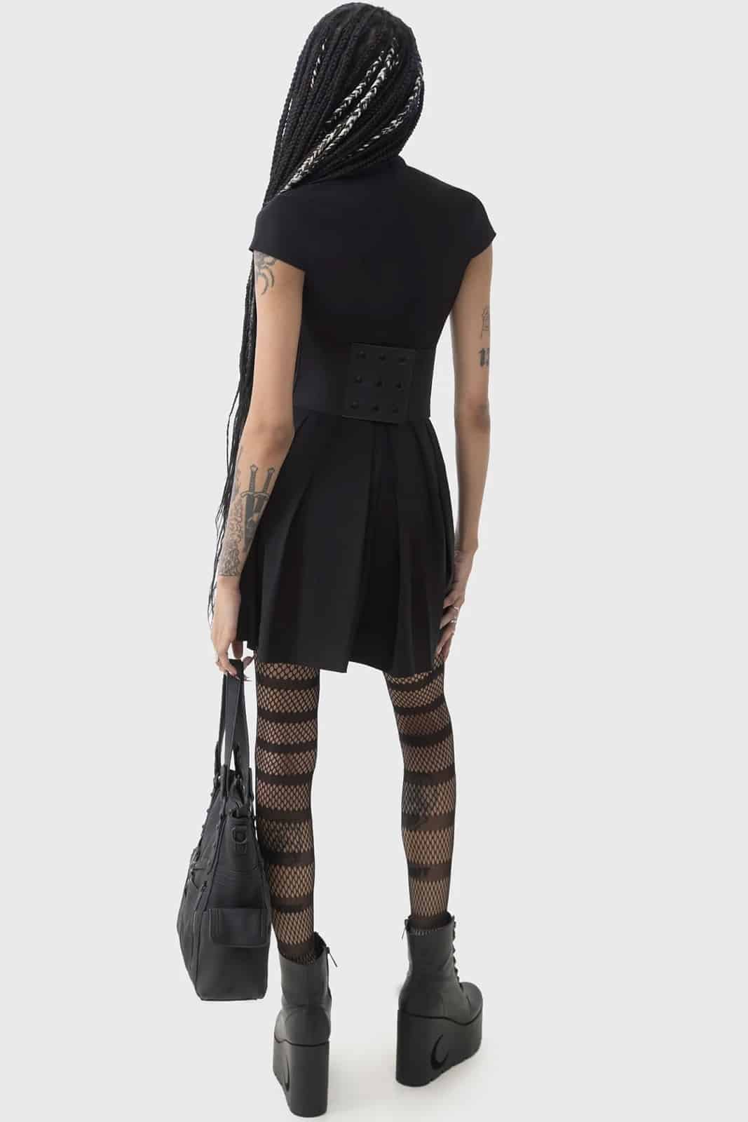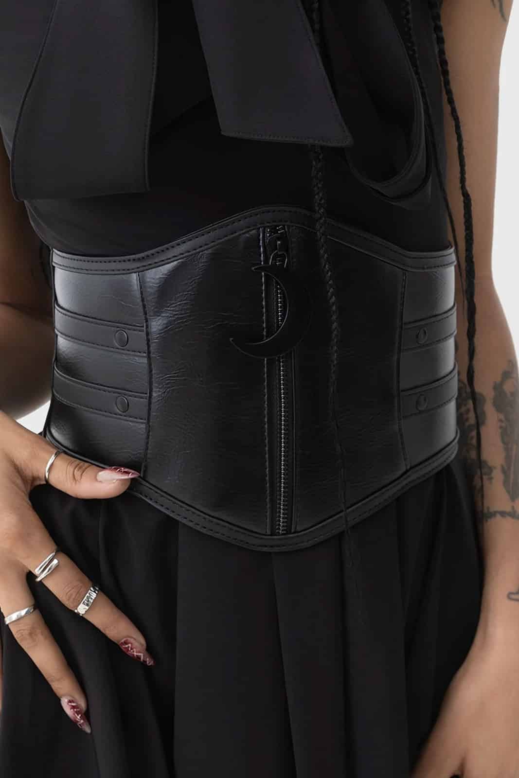 Kunstleder-Gürtel aus der Kihilist-Reihe mit Reißverschluß und großem Mondanhänger. Bestückt mit elastischen Einsätzen und verstellbarem Druckknopfverschluß im Rücken.