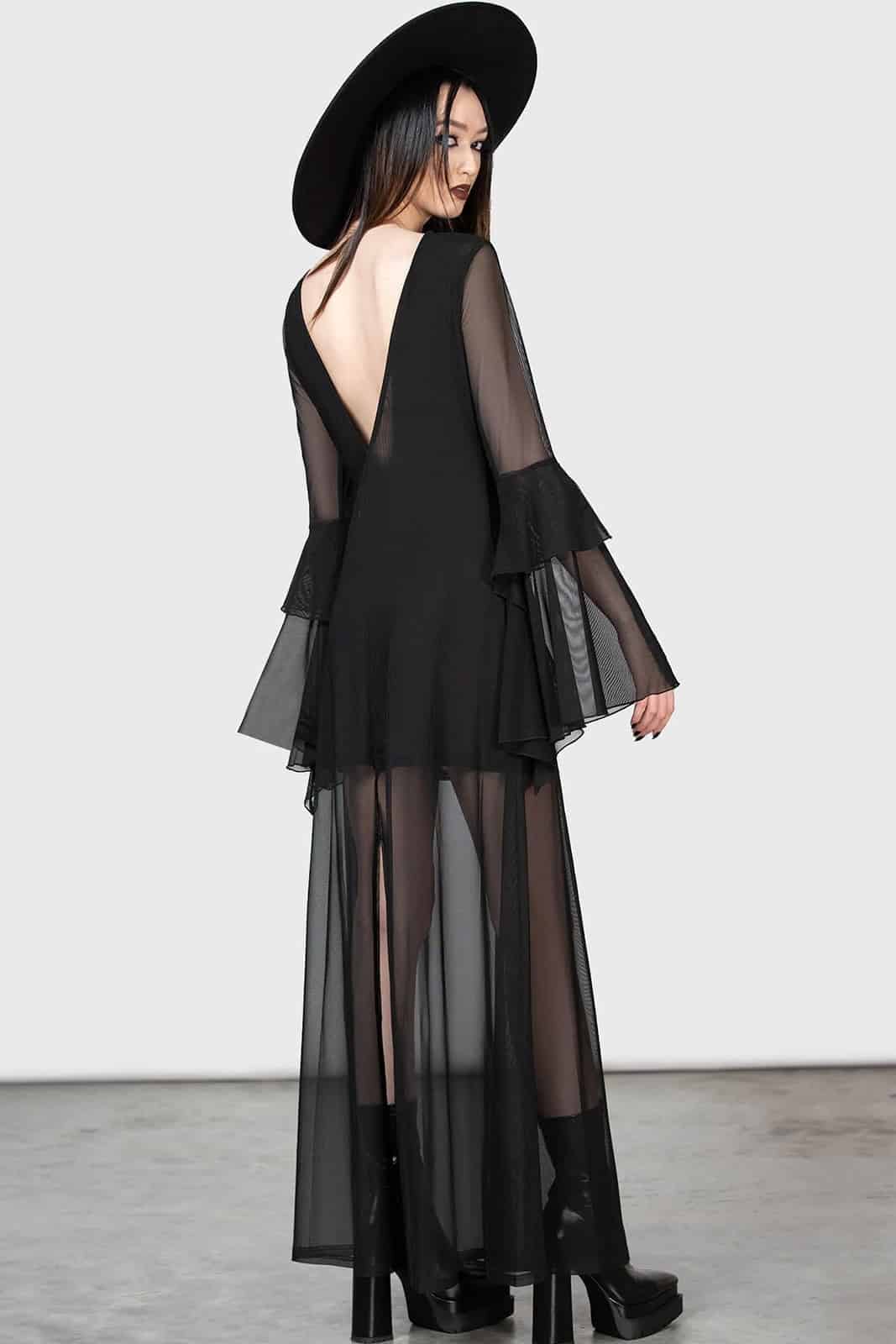 Weiches, transparentes Kleid mit langen, doppellagigen Trompetenärmeln. Mit integriertem transparentem Slip. Bei Bedarf kann wie auf dem Bild gezeigt ein zusätzliches blickdichtes Kleid darunter getragen werden.