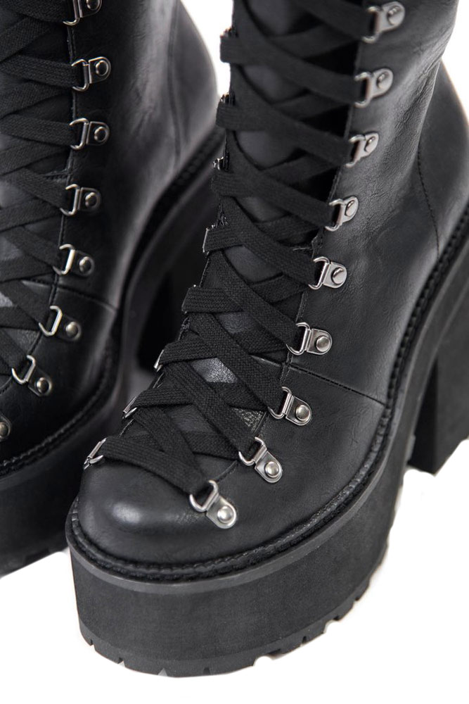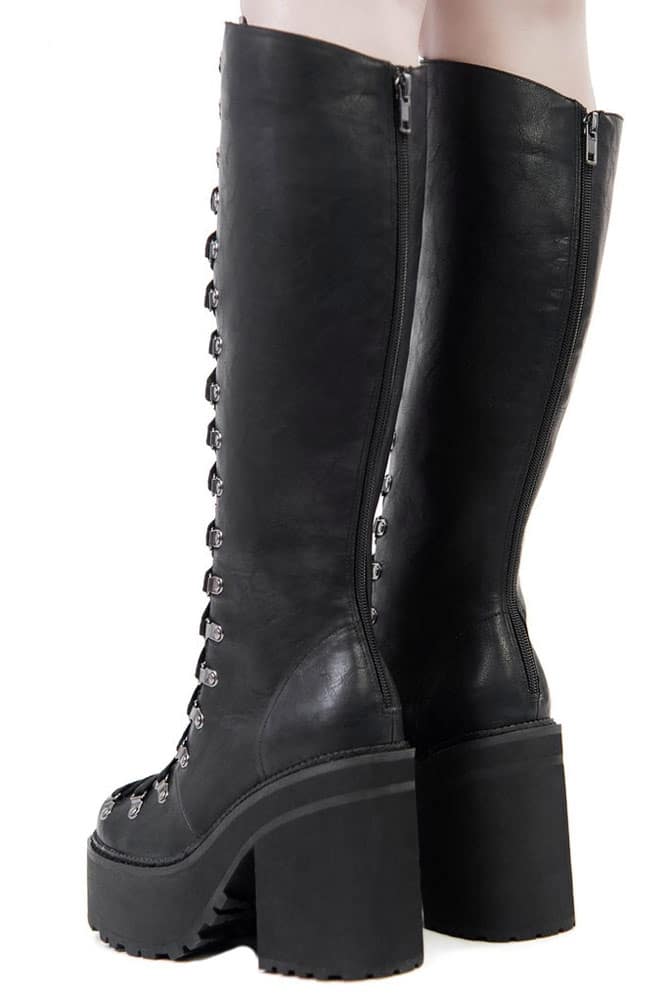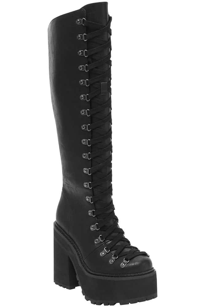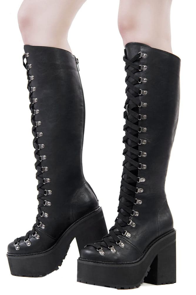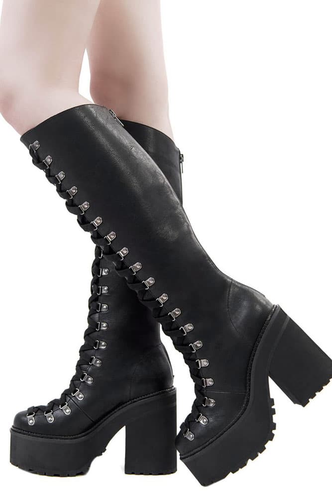 Hohe Gothic Plateau-Stiefel aus Kunstleder, vegan, mit Schnürung, Reißverschluß und Blockabsatz.