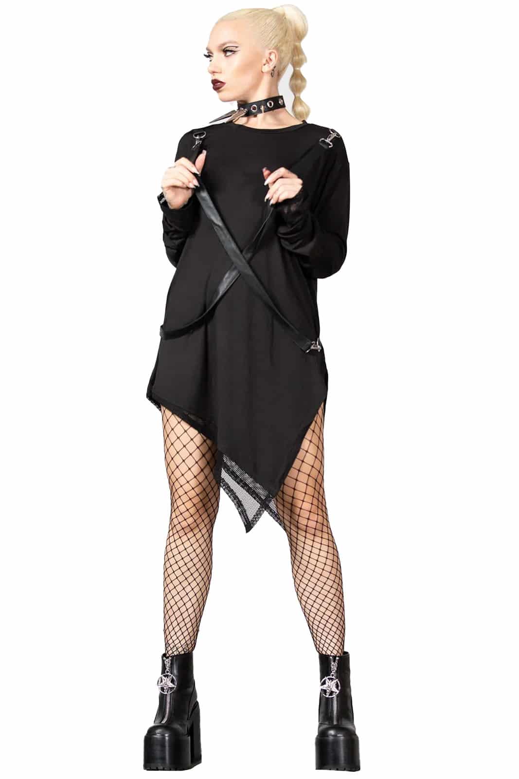 Long cut women’s top with zip hem and mesh inserts. Equipped with removable faux leather straps. With long sleeves and a round neckline. The material is super-stretchy and comfortable to wear.