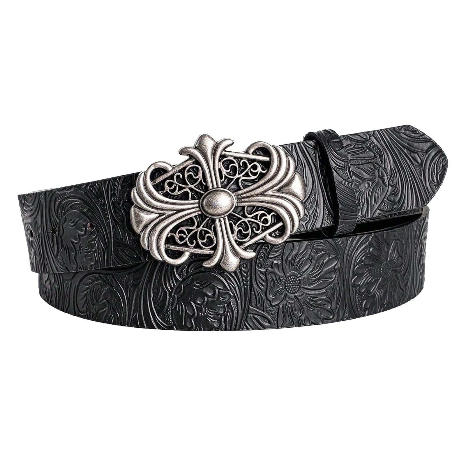 Der Arcane Floris Gürtel vereint barocke Eleganz mit mystischer Symbolik. Auf dem schwarzen, kunstvoll geprägten Riemen entfalten sich florale Ornamente und feine Muster, während die silberne Schnalle mit kreuzartigem Design den Blick auf sich zieht. Ein stilvolles Accessoire für Gothic-, Vintage- und Mittelalter-Looks – kraftvoll, edel und zeitlos düster.