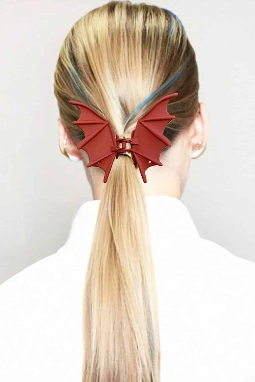 Einzelne rote Haarklammer in Form von Fledermausflügeln aus Kunststoff.