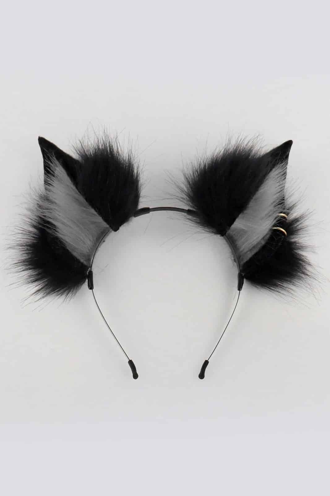 1 Paar schwarz-graue, flauschige Fledermausohren aus Polyester auf einem biegsamen Kopfreif.