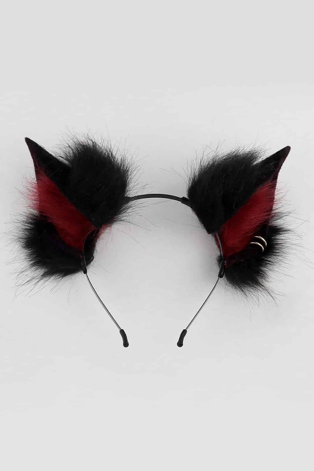 1 Paar schwarz-rote, flauschige Fledermausohren aus Polyester auf einem biegsamen Kopfreif.