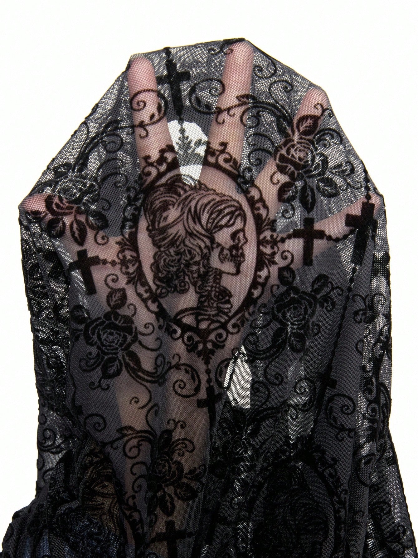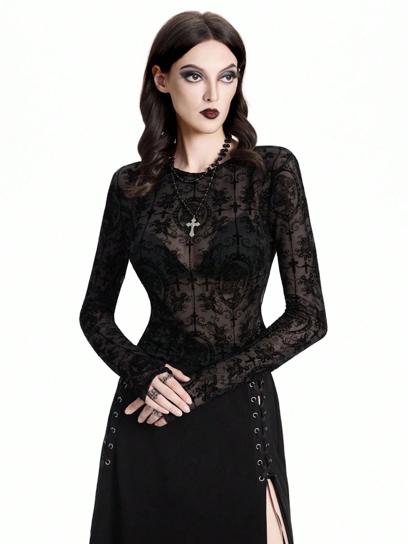 Das Cathedral Whisper Top besticht durch sein feines, transparentes Netzmaterial mit samtiger Beflockung in barockem Muster. Die detailreichen Ornamente mit Kreuzmotiven verleihen dem Design einen Hauch sakraler Eleganz, während der figurbetonte Schnitt die Silhouette betont. Ein edles Statement-Piece – perfekt zum Layern über Tops oder Bodys und ideal für alle, die dunkle Romantik mit kultiviertem Stil verbinden.