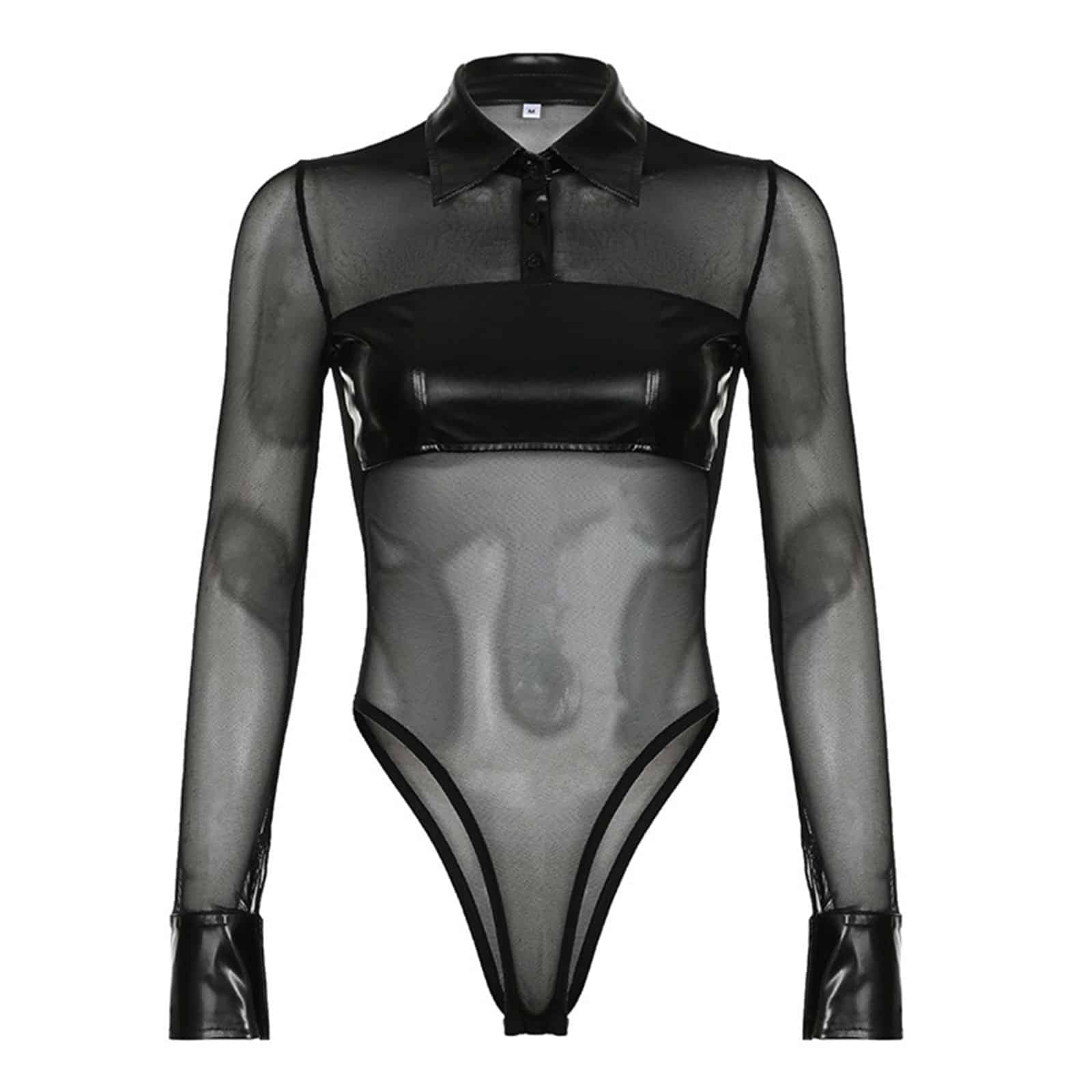 Netzbody aus weichem und elastischen Material mit einem leicht glänzendem, blickdichtem Kunstlederband über der Brust. Der Kragen und die Ärmelbündchen aus Kunstleder sind mit schwarzen Knöpfen besetzt. Im Schritt mit zwei Druckknöpfen zu schließen