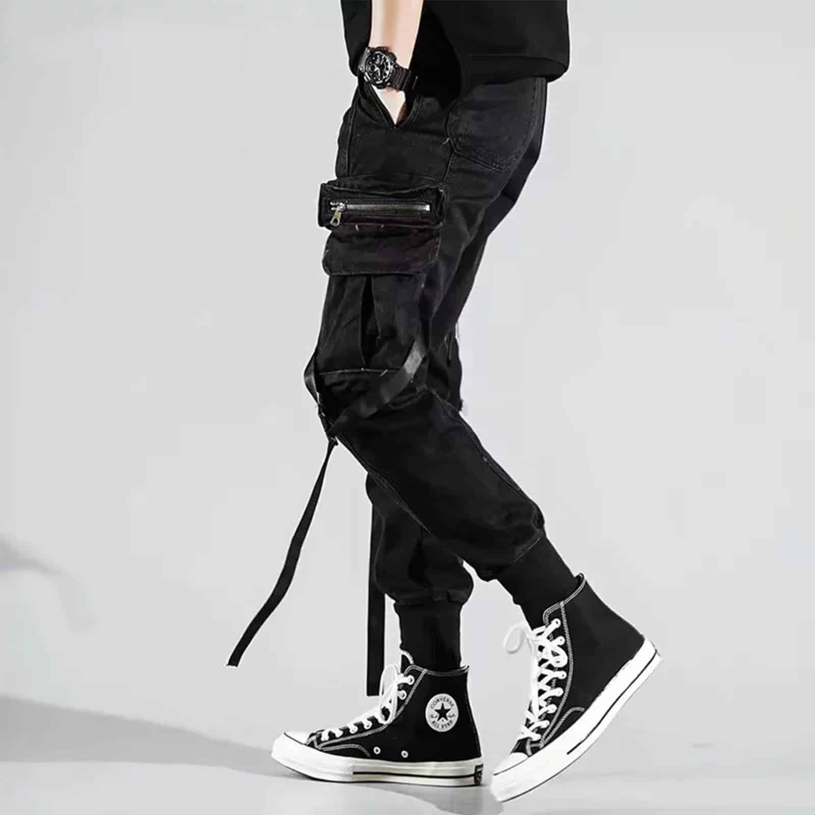 Lässige Hose mit elastischem Gummibund und Kordelzug. Seitlich sind zwei Einschubtaschen eingearbeitet. Zwei Gesäßtaschen finden sich auf der Rückseite. Auf den Schenkeln sind beidseitig Taschen aufgesetzt. Am linken Schenkel findet sich noch eine zusätzliche kleine Reißverschlußtasche. Breite bequeme Bündchen schließen die Hose am Bein ab. An den Schenkeln sind verstellbare Riemen angebracht.