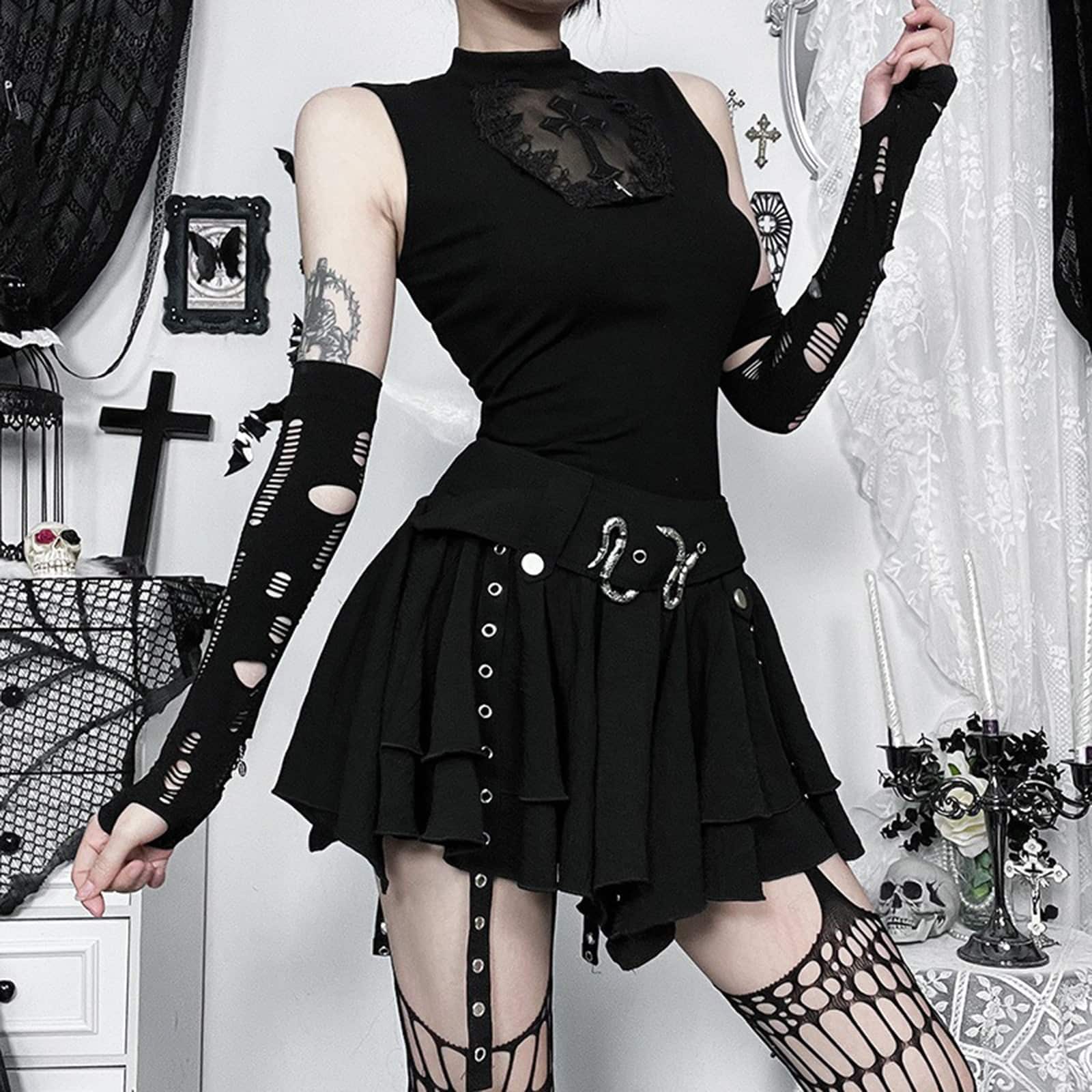 Ein rebellisches Statement mit auffälligen Details und markanter Silhouette. Die mehrlagige Konstruktion schafft ein kraftvolles Volumen, das durch asymmetrische Kanten und großzügige Ösenverzierungen eine punkige Attitüde erhält. Highlight ist die silberne Schlangenschnalle am breiten Bund, die dem Design eine gefährlich-verführerische Note verleiht. Lange Zierbänder mit Metallösen betonen den Industrial-Charakter und machen den Look zu einem echten Eyecatcher – perfekt für düstere Outfits mit Biss.