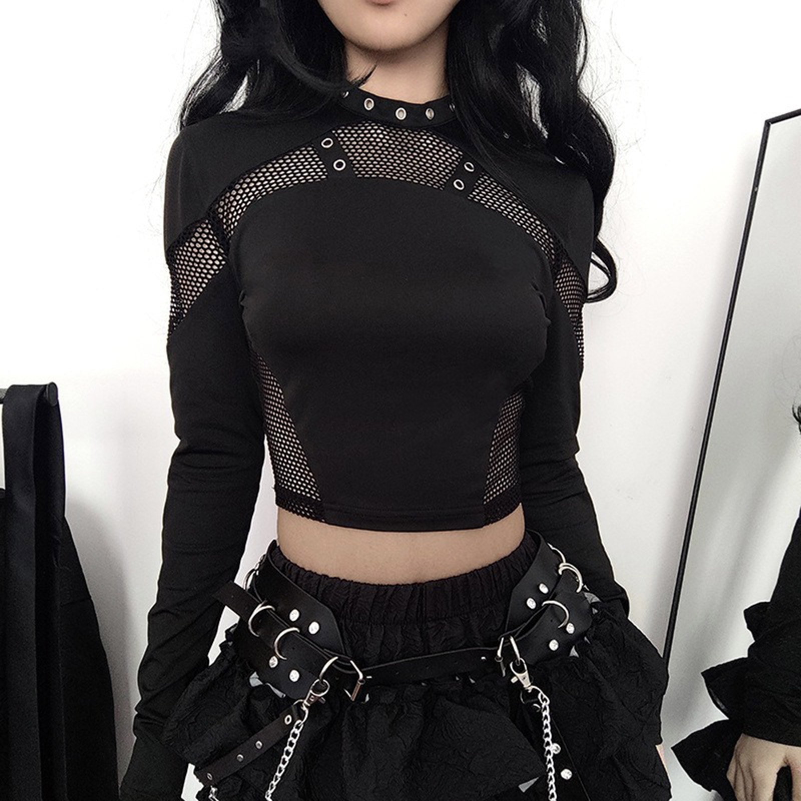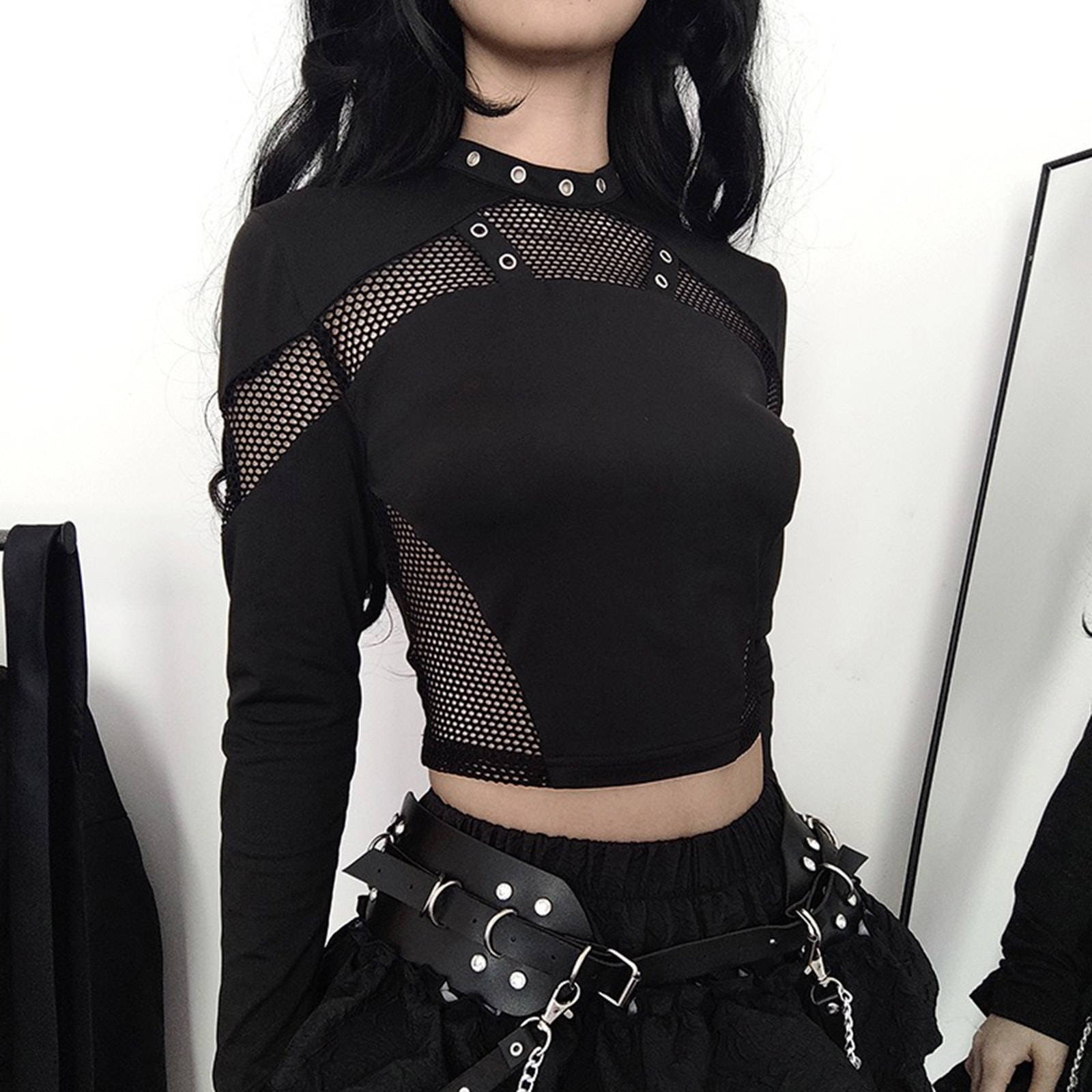 Langarm-Shirt mit Netzeinsatz oberhalb der Brust und an den Seiten. Der reizvolle Netzeinsatz erstreckt sich bis über die Oberarme. Der hoch geschnittene Rundhalsausschnitt ist mit silbernen Ösen besetzt.