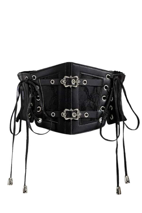 Faux leather bodice belt with elastic band and four snaps in the back. The front is decorated two beautifully shaped buckles and mesh insert. There are two imitation leather laces on the sides.