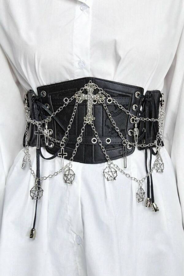 Bodice belt made from a high-quality faux leather front panel with an elastic back band fitted with press studs. The front also has side lacing to adjust the bodice perfectly to the waist. Decorated with crosses, spider webs and silver chains.