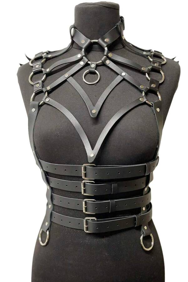 Dieses eindrucksvolle Harness aus schwarzem Kunstleder vereint Stärke und Sinnlichkeit. Mehrere verstellbare Riemen schmiegen sich eng an den Körper, während silberne Ringe den Look mit einem Hauch von Dominanz vollenden. Das Highlight sind die kunstvoll gearbeiteten Flügel am Rücken, die eine okkult-religiöse Symbolik tragen – wie die eines gefallenen Engels. Ein kraftvolles Statement-Piece für düstere Outfits, Rituale oder die Bühne.