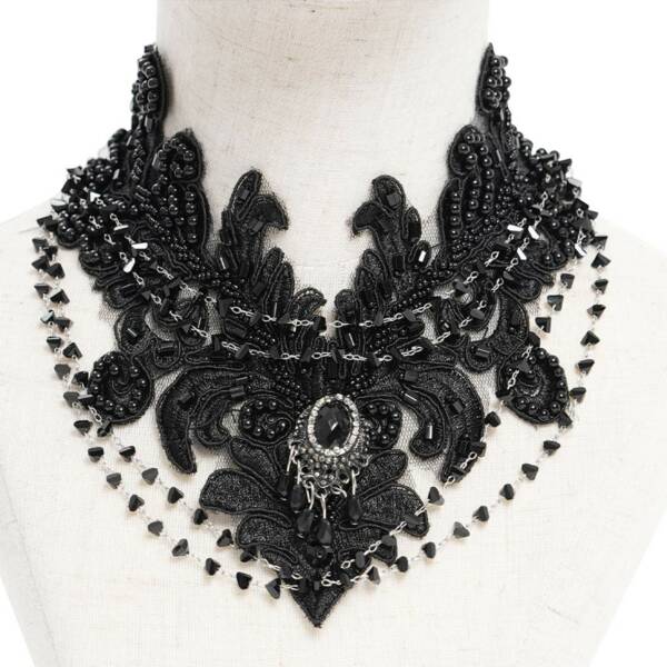 Dramatisch und erhaben – dieses aufwendig gestaltete Collier ist ein wahres Meisterwerk viktorianischer Gothic-Ästhetik. Die schwarze Stickspitze bildet die Basis und wird von kunstvollen Perlenapplikationen und herabfallenden Ketten veredelt die geheimnisvoll im Licht schimmern. Im Zentrum thront ein Kristallmotiv eingefasst in einem silberfarbenen Strassrahmen mit funkelnden Anhängern die dem Design eine majestätische Ausstrahlung verleihen. Durch die verstellbare Kette mit Karabinerverschluss sitzt das Schmuckstück komfortabel und passt sich jeder Halsform an. Aus 100% Polyamid gefertigt ist es das perfekte Accessoire für düstere Eleganz viktorianische Outfits und eindrucksvolle Auftritte.