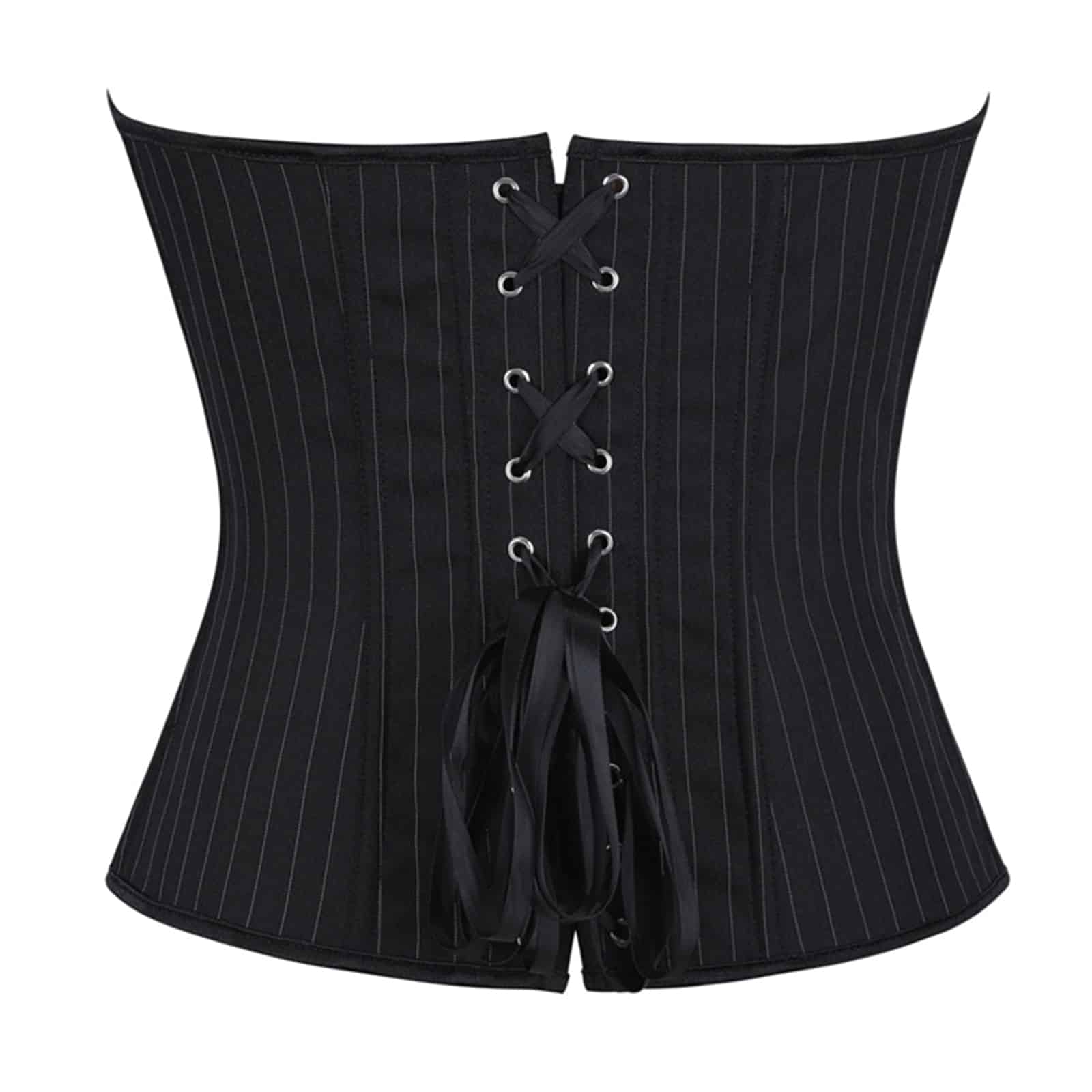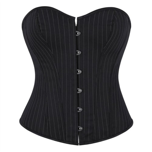 Markant, taillenformend und mit klassischer Nadelstreifen-Optik – diese Überbrustcorsage vereint Business-Ästhetik mit dunkler Eleganz. Die geschwungene Linienführung betont die Silhouette und sorgt für eine kraftvolle, feminine Präsenz – perfekt für Gothic, Steampunk oder stilvolle Statement-Looks.
