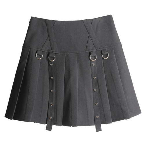 Verspielt trifft auf Dark Attitude – der Minirock The Small Hearts kombiniert klassische Falten mit auffälligen Metall-Details. Kleine Herz-Elemente und silberfarbene D-Ringe verleihen dem Look eine süß-düstere Note und machen ihn zum perfekten Piece für Gothic, Alternative und Streetstyle Outfits.