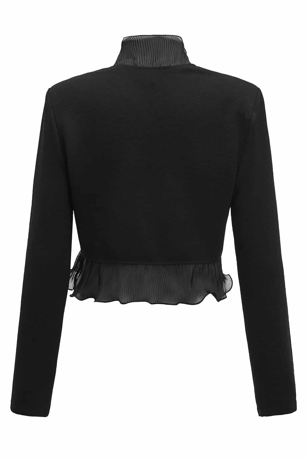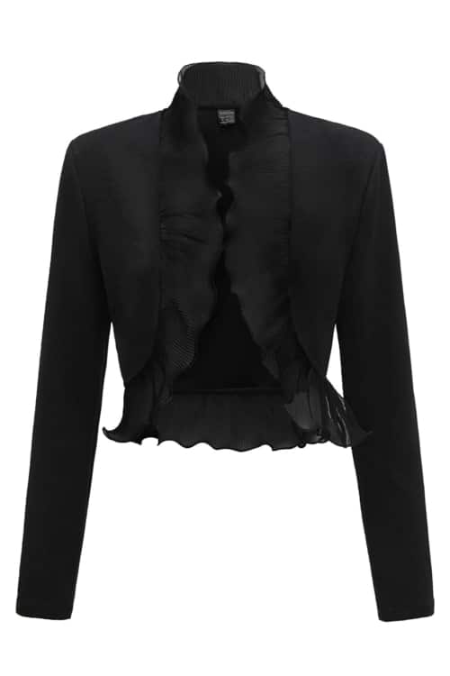 Wunderschöne elegante Gothic-Jacke mit Rüschenbesatz und offener Front. Mit langen Ärmeln und einem kurzen Stehkragen. Das Material ist leicht dehnbar und passt sich der Körperkontur an.