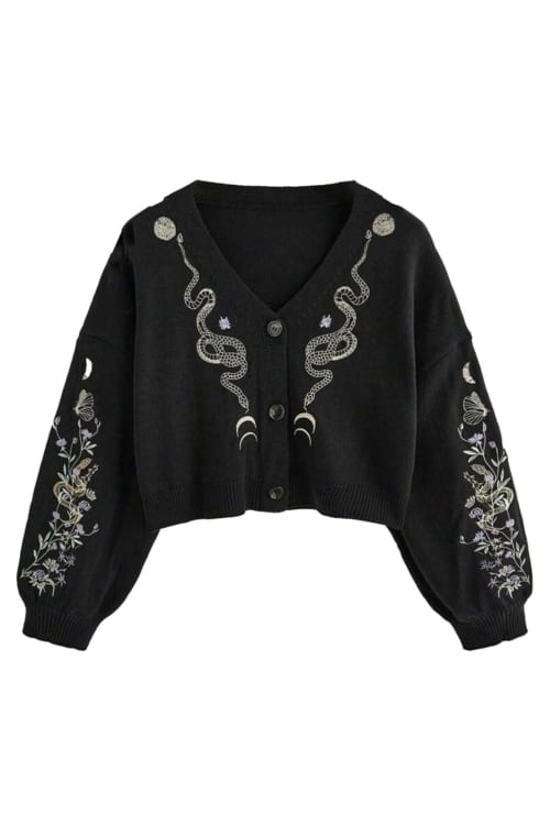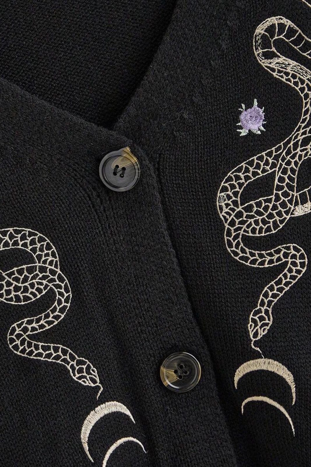 Leicht stretchiges Jäckchen mit drei großen Knöpfen an der Vorderseite, langen Ärmeln und tiefem V-Ausschnitt. Die Ärmel sind mit weichen Bündchen bestückt. Die Vorderseite ist mit Schlangen und Monde bestickt. Die Ärmel sind mit Farnen und Schmetterlingen bestickt.
