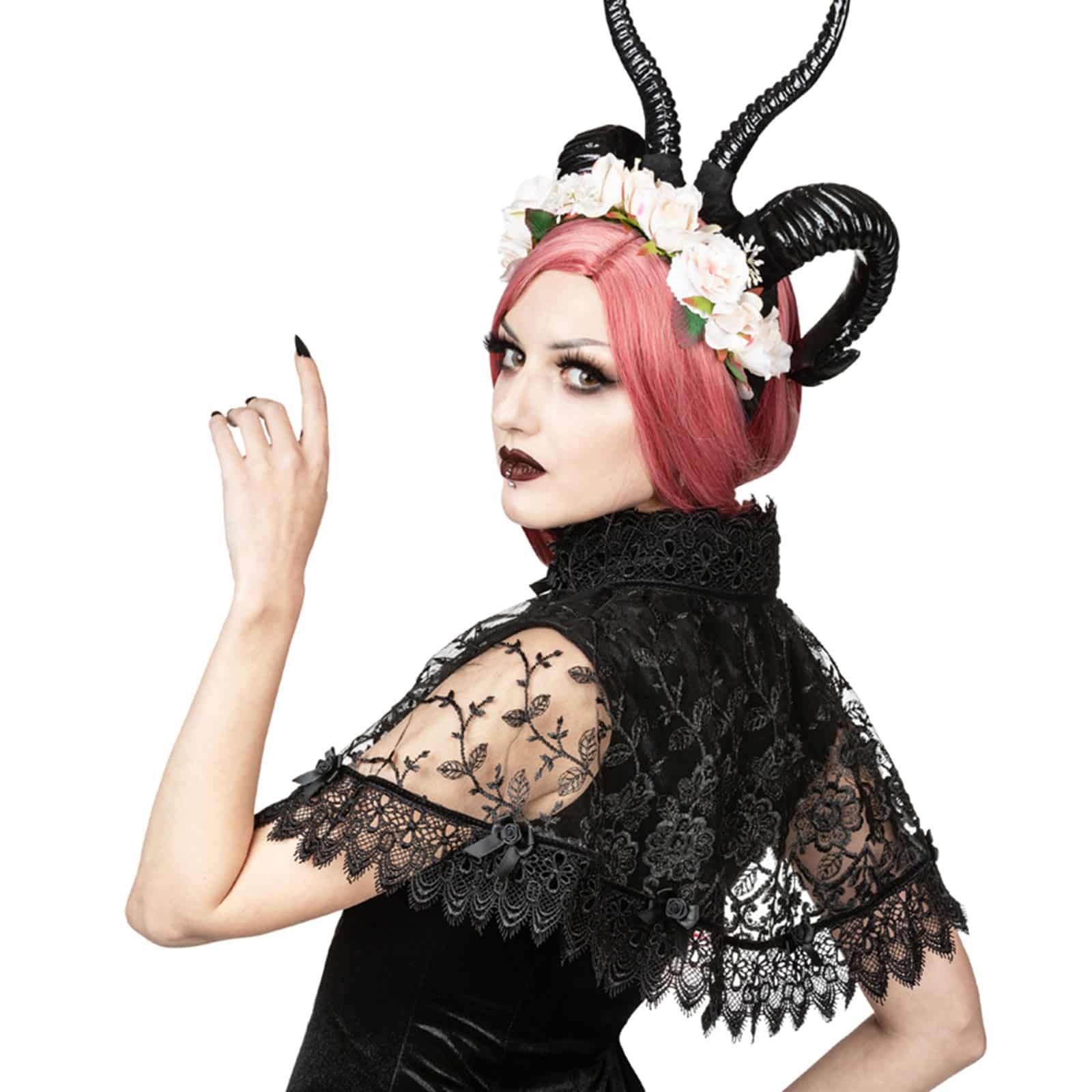 Elegantes schwarzes Gothic-Cape aus Brokatspitze. Dieses hübsche viktorianische Cape hat einen Stehkragen aus Samt und ist mit venezianischer Spitze und schwarzem Samtband verziert, das den gesamten Halsausschnitt und Saum umgibt. Satinschleifen und Rosenknospen schmücken das Cape. Ein Samtbandverschluss vorne rundet das Design ab.