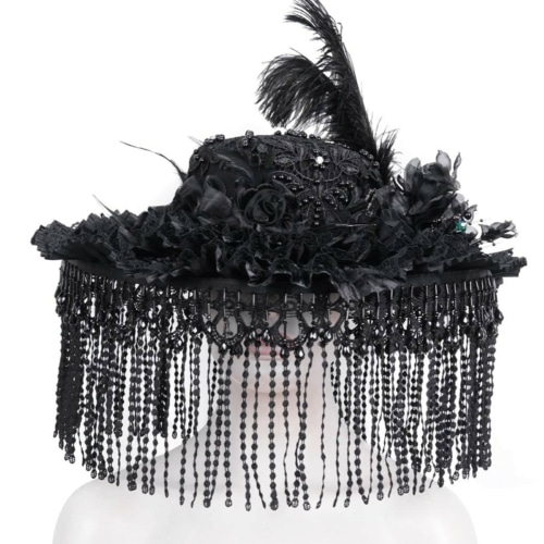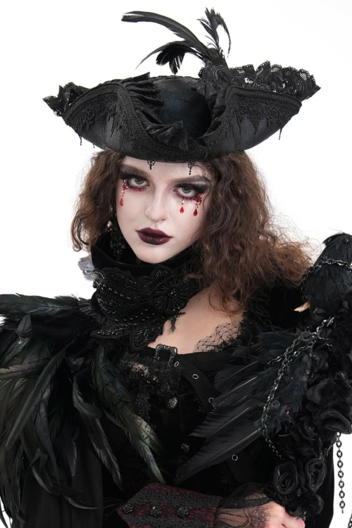 Der Marie-Antoinette-Hut verkörpert die Pracht und Dramatik der Höfe des 18. Jahrhunderts mit einem gotischen Touch. Der Dreispitz, traditionell ein Symbol königlicher Macht, wurde mit einem schwarz verwitterten Finish neu interpretiert und verströmt eine Aura verblasster Opulenz. Die Krempe ist mit aufwendigen Stickereien verziert und verleiht dem Hut ein edles Detail, während die Spitzenrüsche am Rand den Look mit ihrem zarten Charme weicher macht. Sorgfältig platzierte Federn runden dieses majestätische Stück ab und verleihen ihm einen Hauch aristokratischen Flairs. Mit Wurzeln, die auf die Dreispitz-Hüte der Herrschaft Ludwigs XV. und XVI. zurückgehen, erweckt dieser Hut den Geist eines vergessenen Hofes wieder, an dem gotische Romantik und königliche Geschichte miteinander verschmelzen.