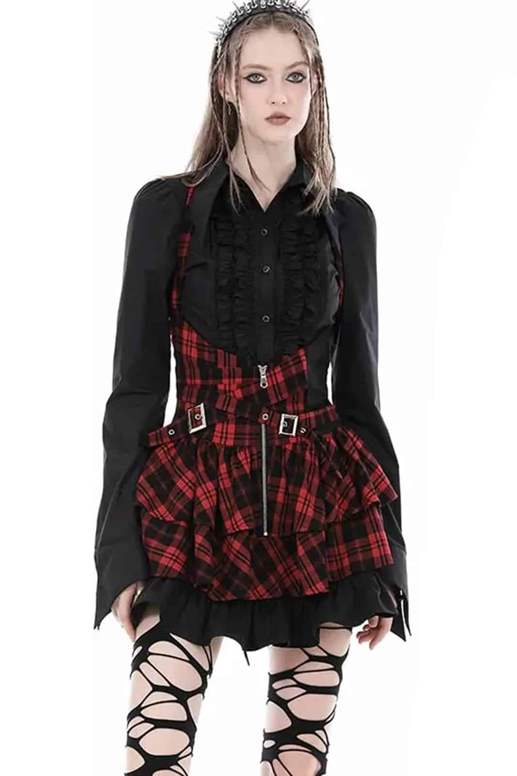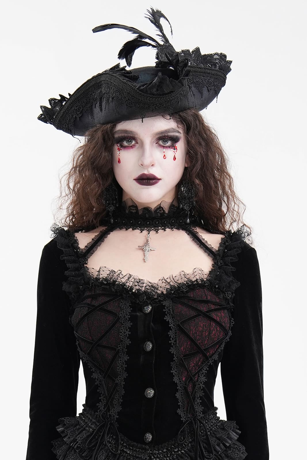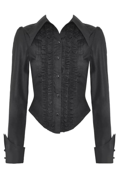 Klassische schwarze Gothic-Bluse mit romantischem Rüschendetail und langen Ärmeln mit spitzen Manschetten. Die Vorderseite ist durchgehend geknöpft.
