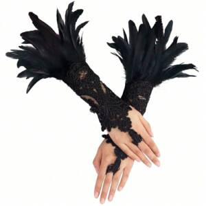 Gefertigt aus Kunstleder (Polyurethan)Ein dramatisches Statement aus Spitze und Federn – wie gemacht für dunkle Eleganz und theatralische Auftritte. Feine, florale Spitze umschmeichelt das Handgelenk und den Handrücken, während anmutige schwarze Federn sich wie Flügel nach oben auffächern. Sie verleihen jedem Outfit eine geheimnisvolle Aura, inspiriert von Raben, Nacht und viktorianischer Extravaganz.