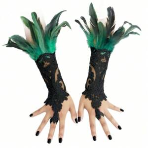 Ideal für Gothic-Mode, Bühnenauftritte, Maskenbälle oder Fotoshootings mit magischem Flair.Ein dramatisches Statement aus Spitze und Federn – wie gemacht für dunkle Eleganz und theatralische Auftritte. Feine, florale Spitze umschmeichelt das Handgelenk und den Handrücken, während anmutige grüne Federn sich wie Flügel nach oben auffächern. Sie verleihen jedem Outfit eine geheimnisvolle Aura, inspiriert von Raben, Nacht und viktorianischer Extravaganz.