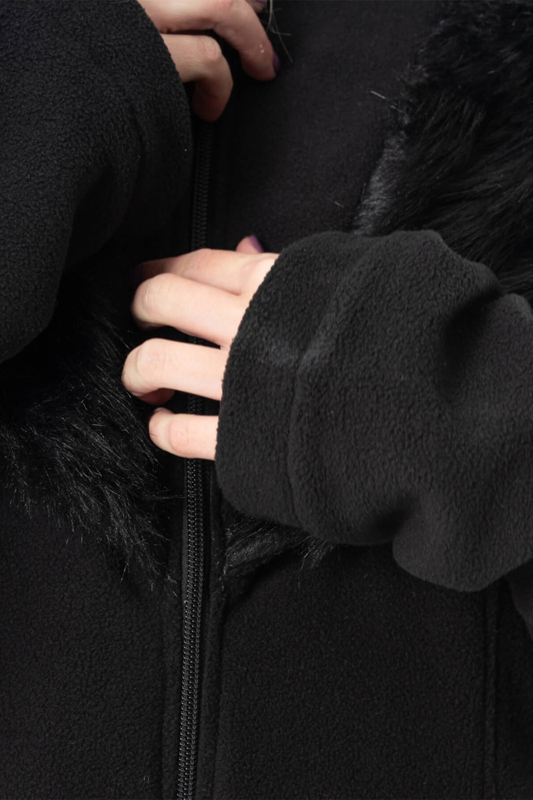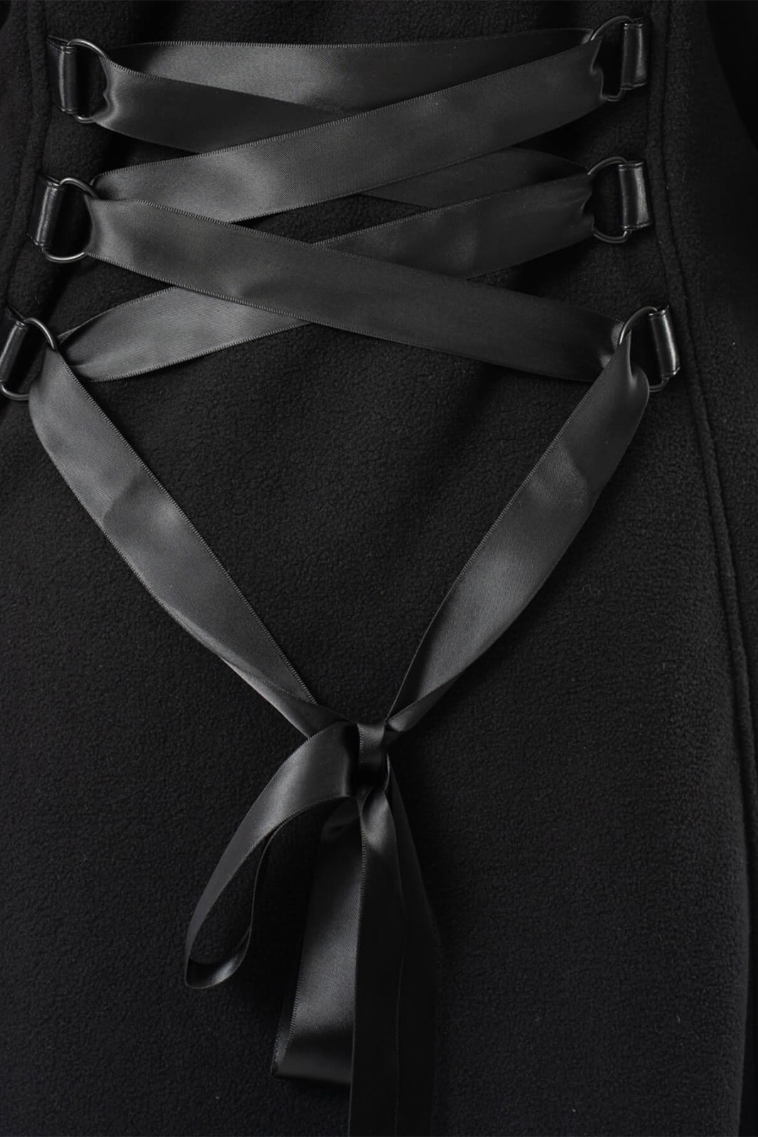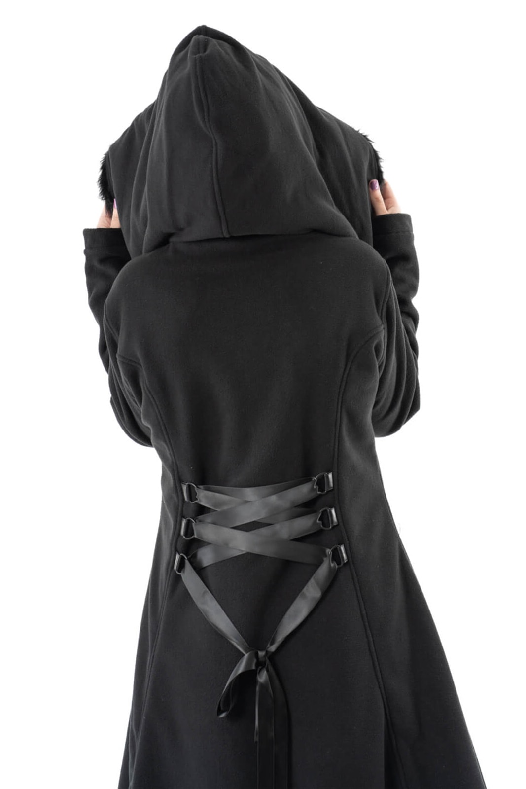 Ein besonderes Highlight ist die dekorative Schnürung im Rücken, die individuell angepasst werden kann und zugleich eine feminine Silhouette betont. Die weiche Fleece-Oberfläche macht den Mantel angenehm warm und gemütlich – ideal für Herbst, Winter und kühle Nächte.