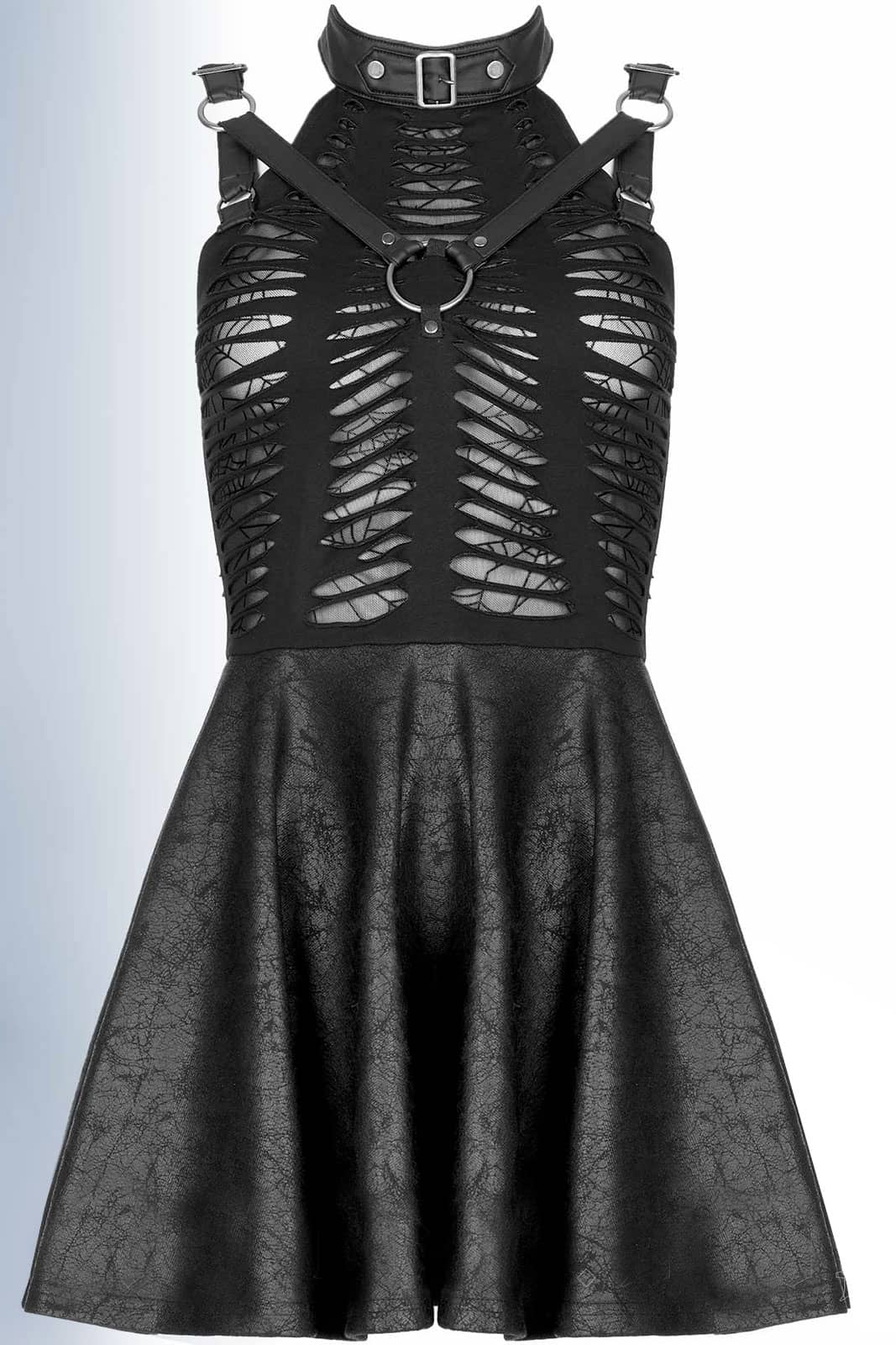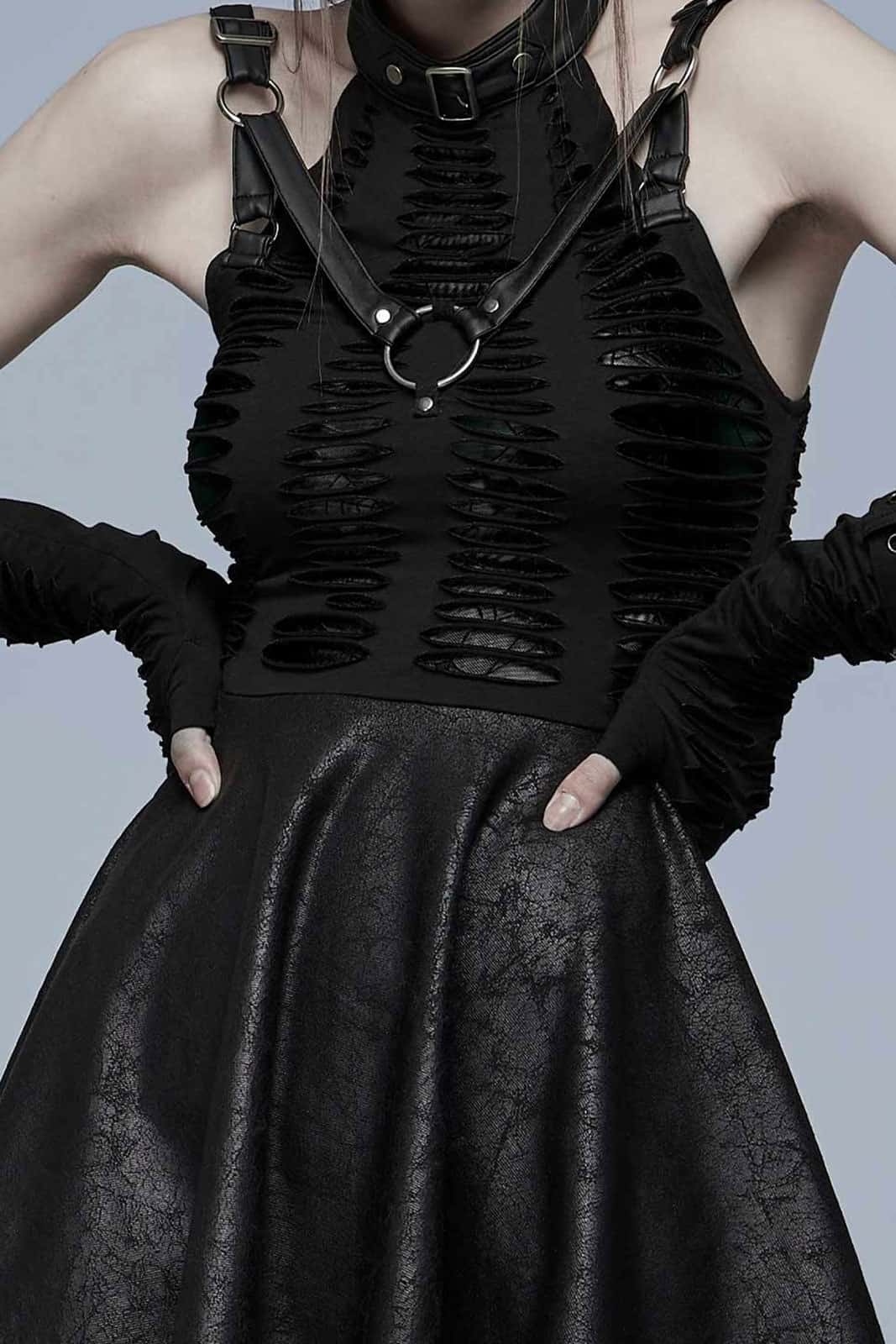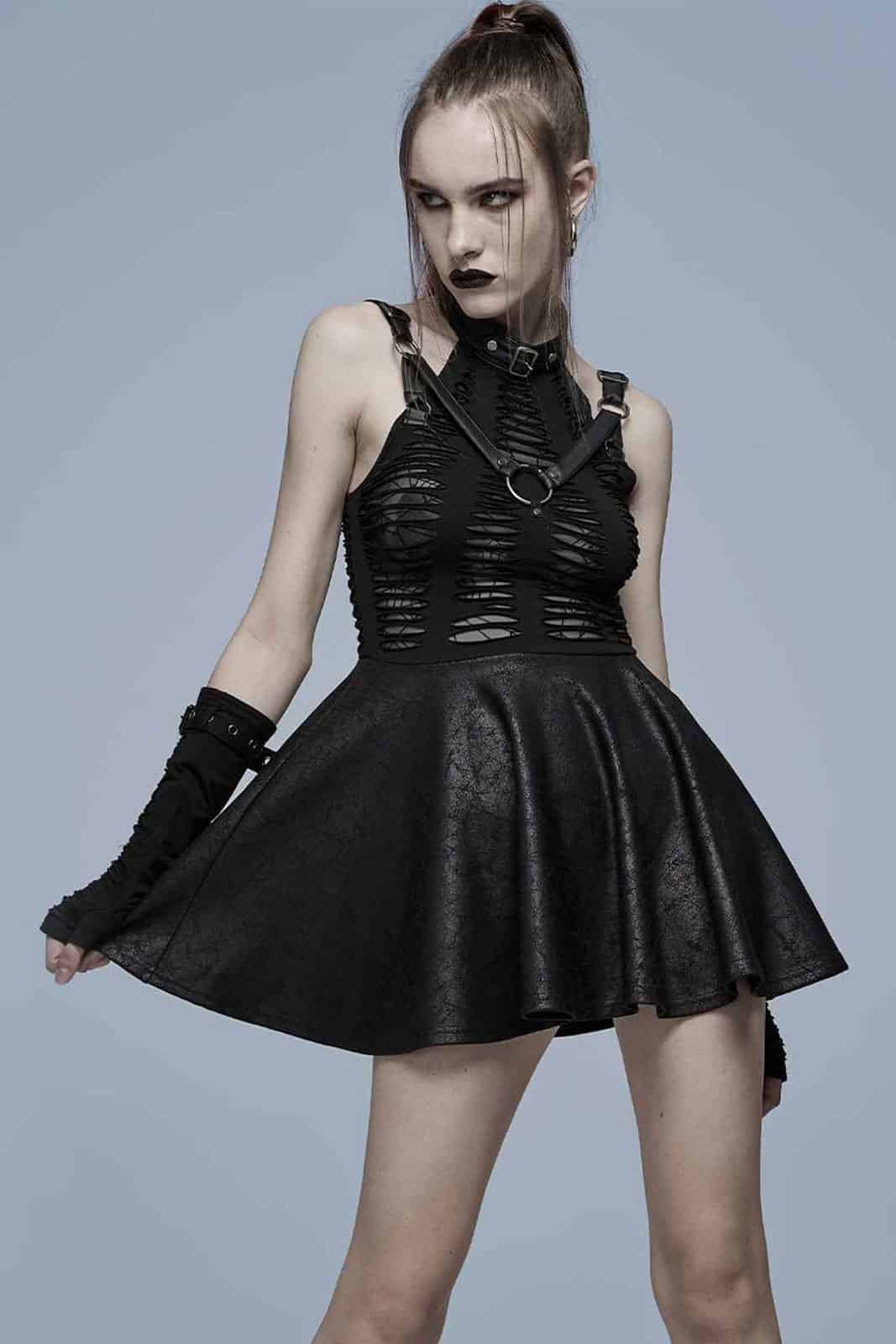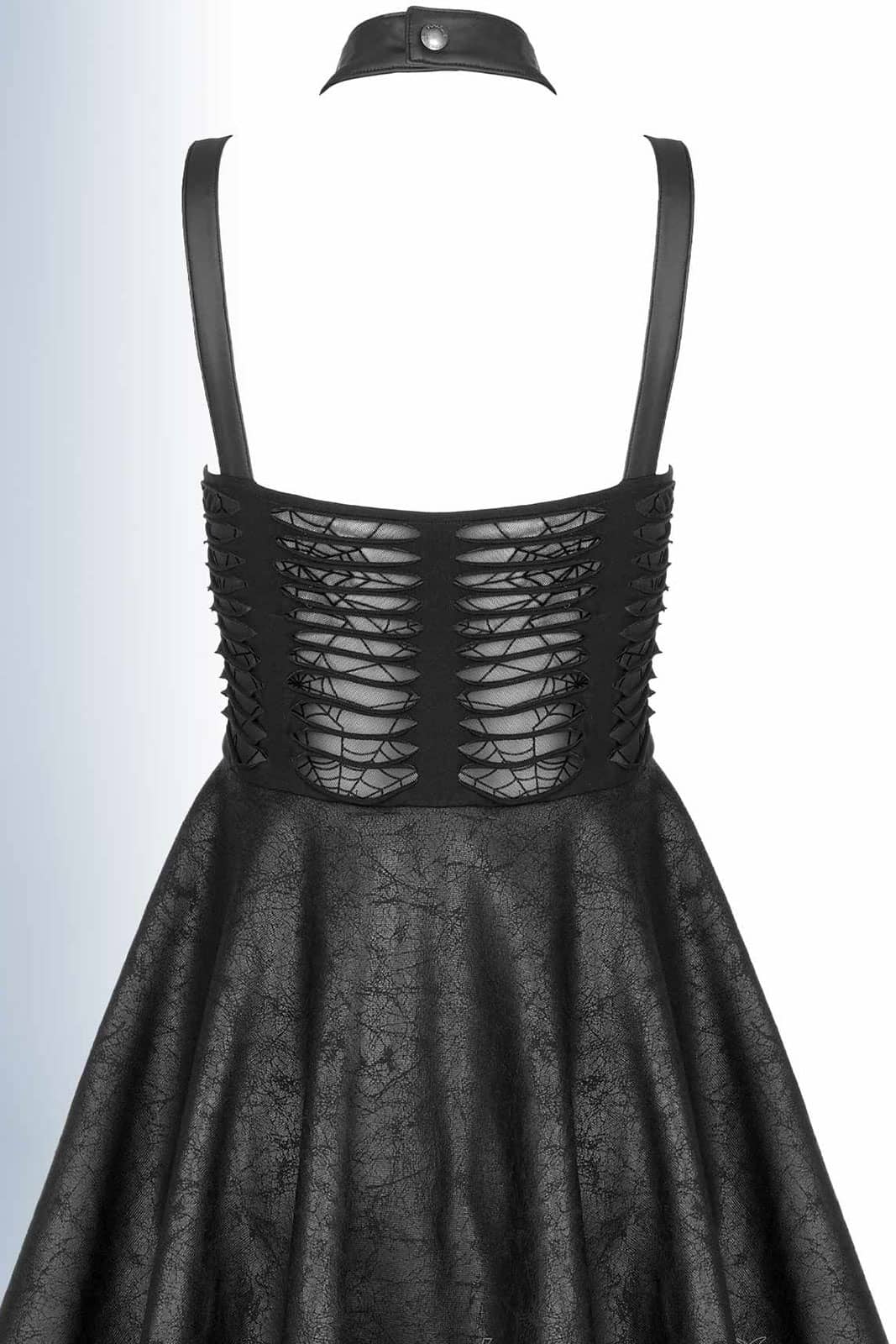 Das Cut-Out-Obermaterial überdeckt zum Teil den darunterliegenden Spinnwebenstoff. Statement-Träger aus Kunstleder sind verstellbar. Der strukturierte Rock aus Lederimitat ist kurz geschnitten. Perfekt um Leggings oder Hotpants darunter zu ziehen.
