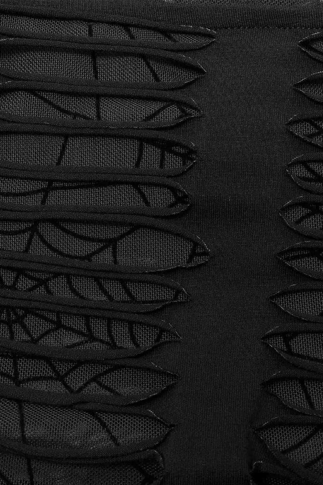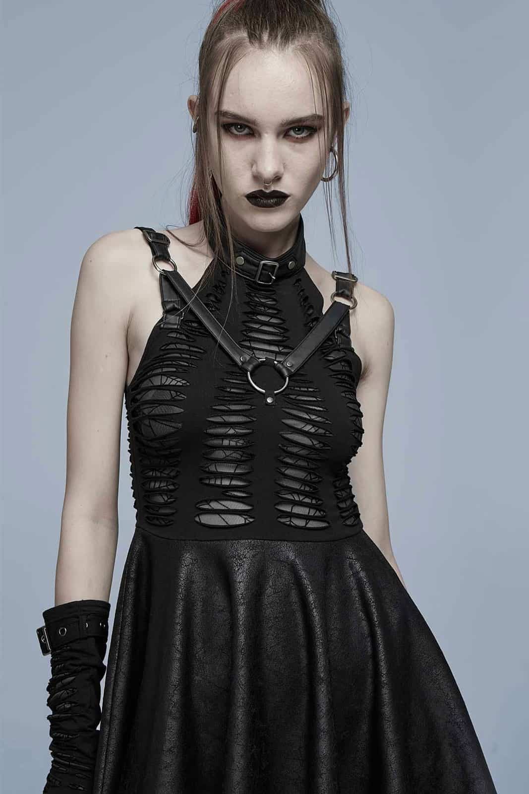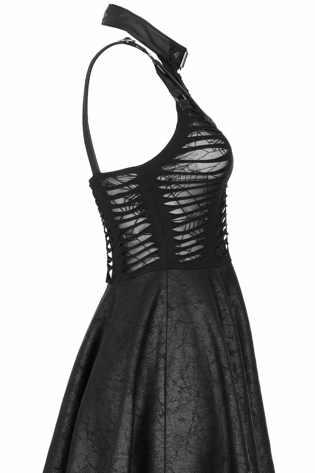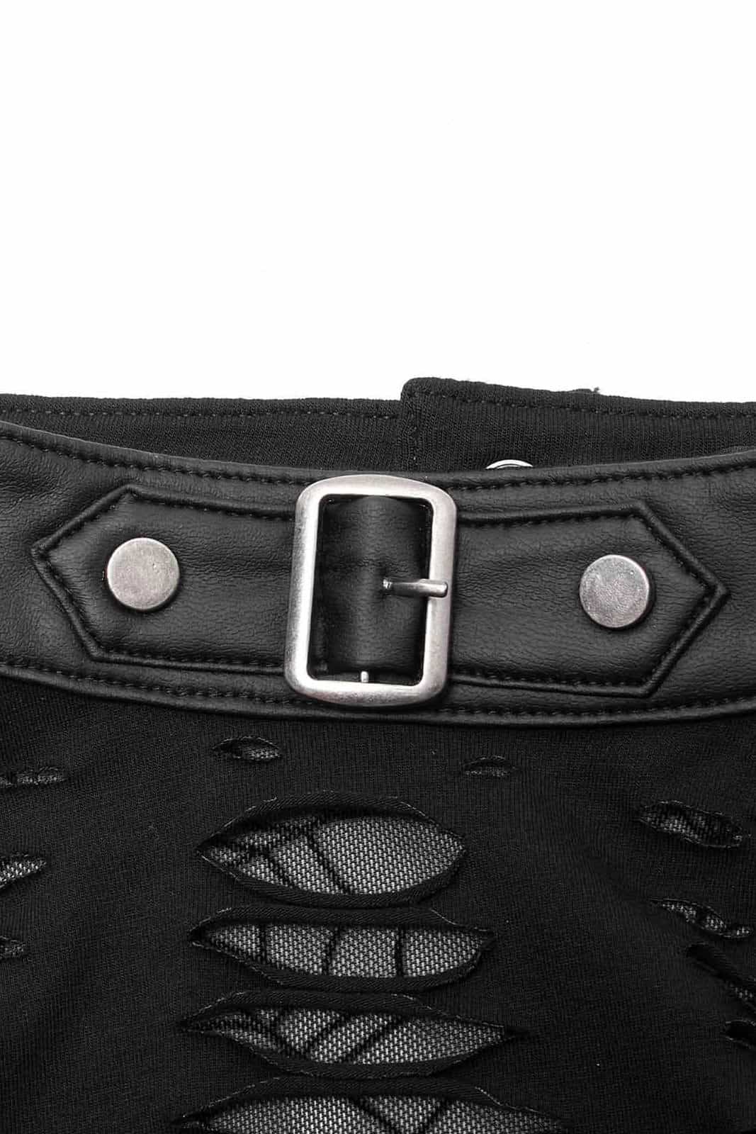 Das Cut-Out-Obermaterial überdeckt zum Teil den darunterliegenden Spinnwebenstoff. Statement-Träger aus Kunstleder sind verstellbar. Der strukturierte Rock aus Lederimitat ist kurz geschnitten. Perfekt um Leggings oder Hotpants darunter zu ziehen.