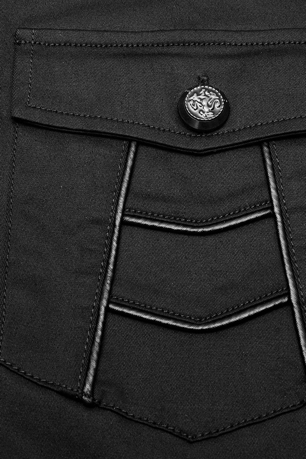 Aus hochwertigem Baumwollstoff gefertigt kommt das Kurzarmhemd Detroit im Militär-Gothic-Stil. Besetzt mit zwei Brusttaschen mit Patte. Verziert mit Kunstlederpaspeln an den Taschen. Die Front wird mit schwarzen Emaille-Knöpfen verschlossen.
