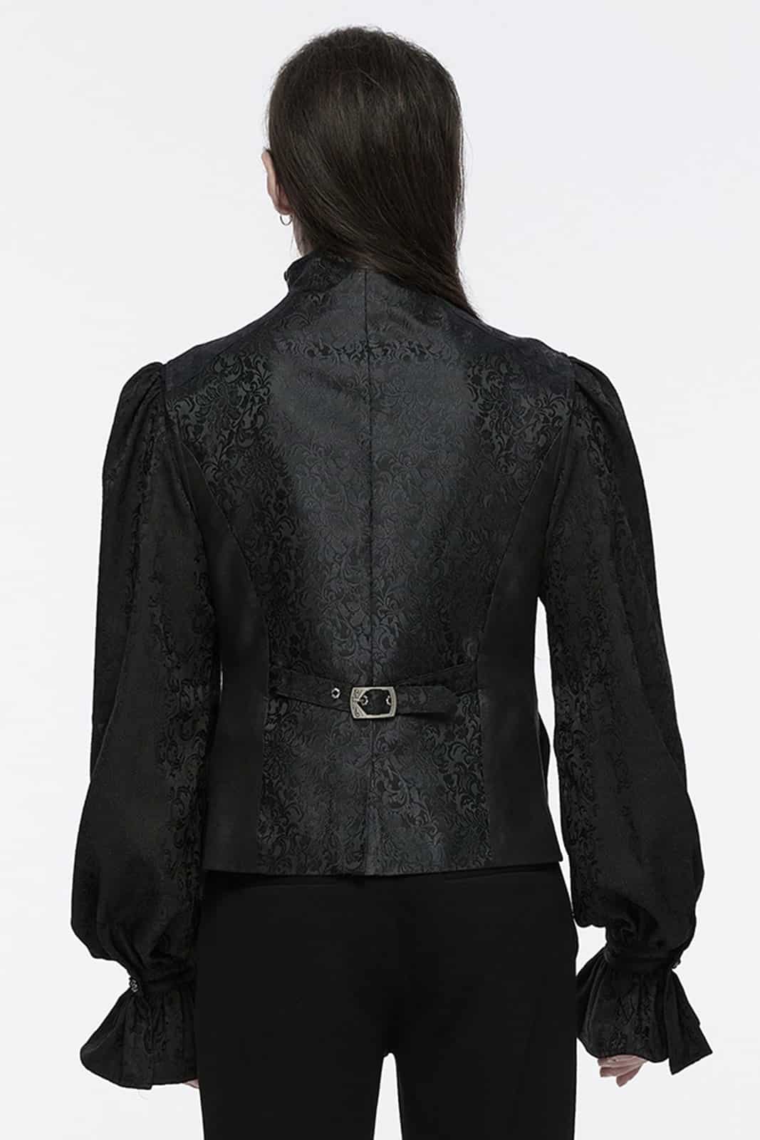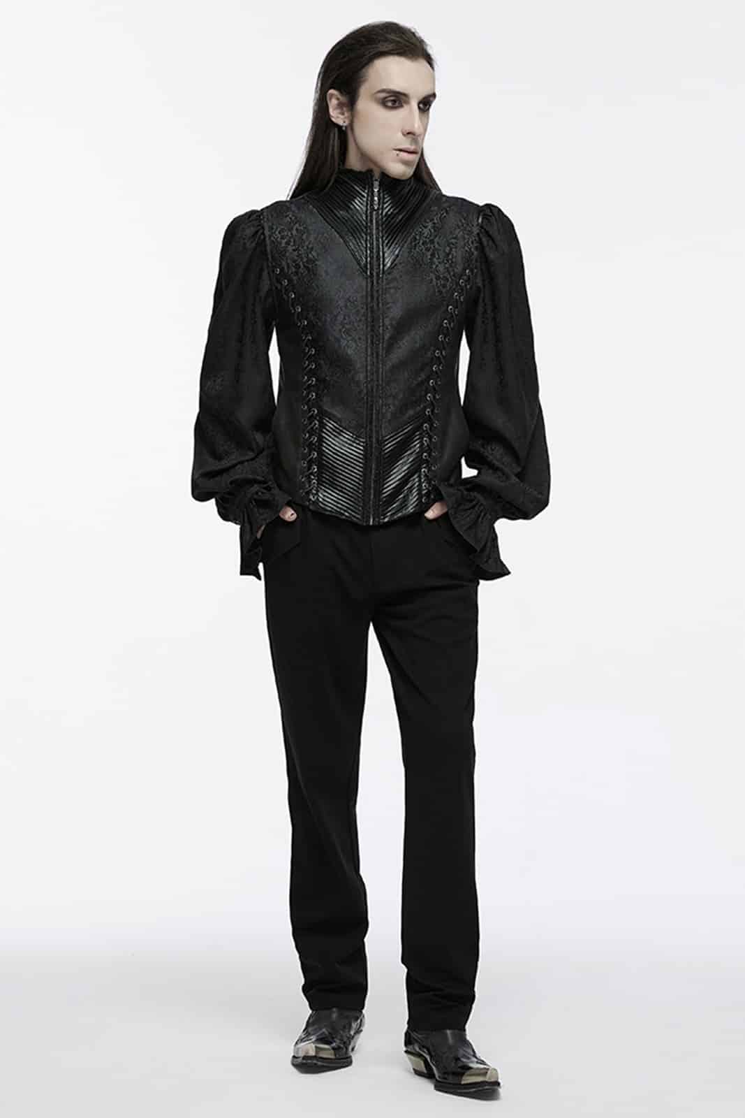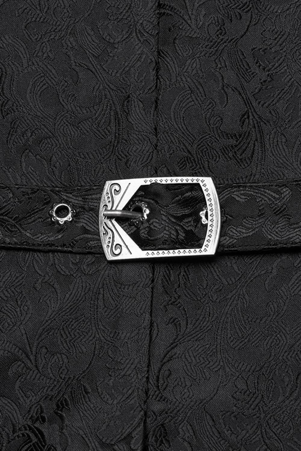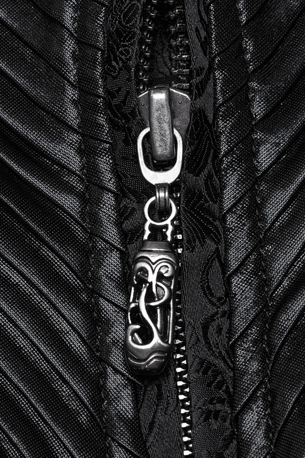 Maskuline Gothic-Weste im viktorianischen Look mit durchgehendem Frontreißverschluß. Der kurze Stehkragen ist optisch verlängert. Seitliche Zierschnürungen sorgen für eine schlanke Taille.
