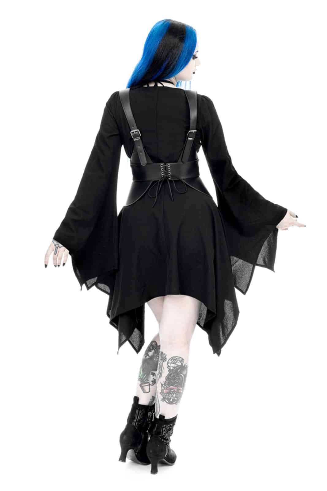 Das knielange Kleid Azael vereint Hexenästhetik, klassische Eleganz und düstere, kantige Energie!