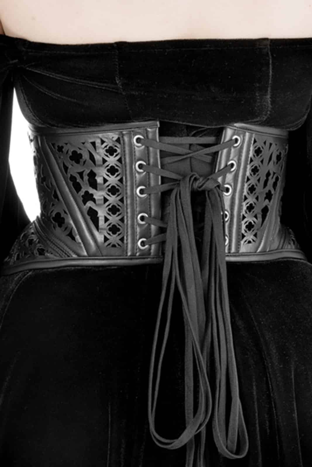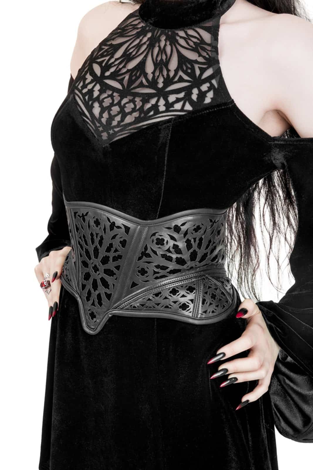 Taillenbetonter Miedergürtel mit Stäbchen für eine perfekte Struktur. Aufwändige lasergeschnittene Details, inspiriert von der gotischen Rose Window-Architektur. Auffällige Textur und Kontrast aus glattem veganem Leder (obere Schicht) und sattem schwarzem Samt (untere Schicht).